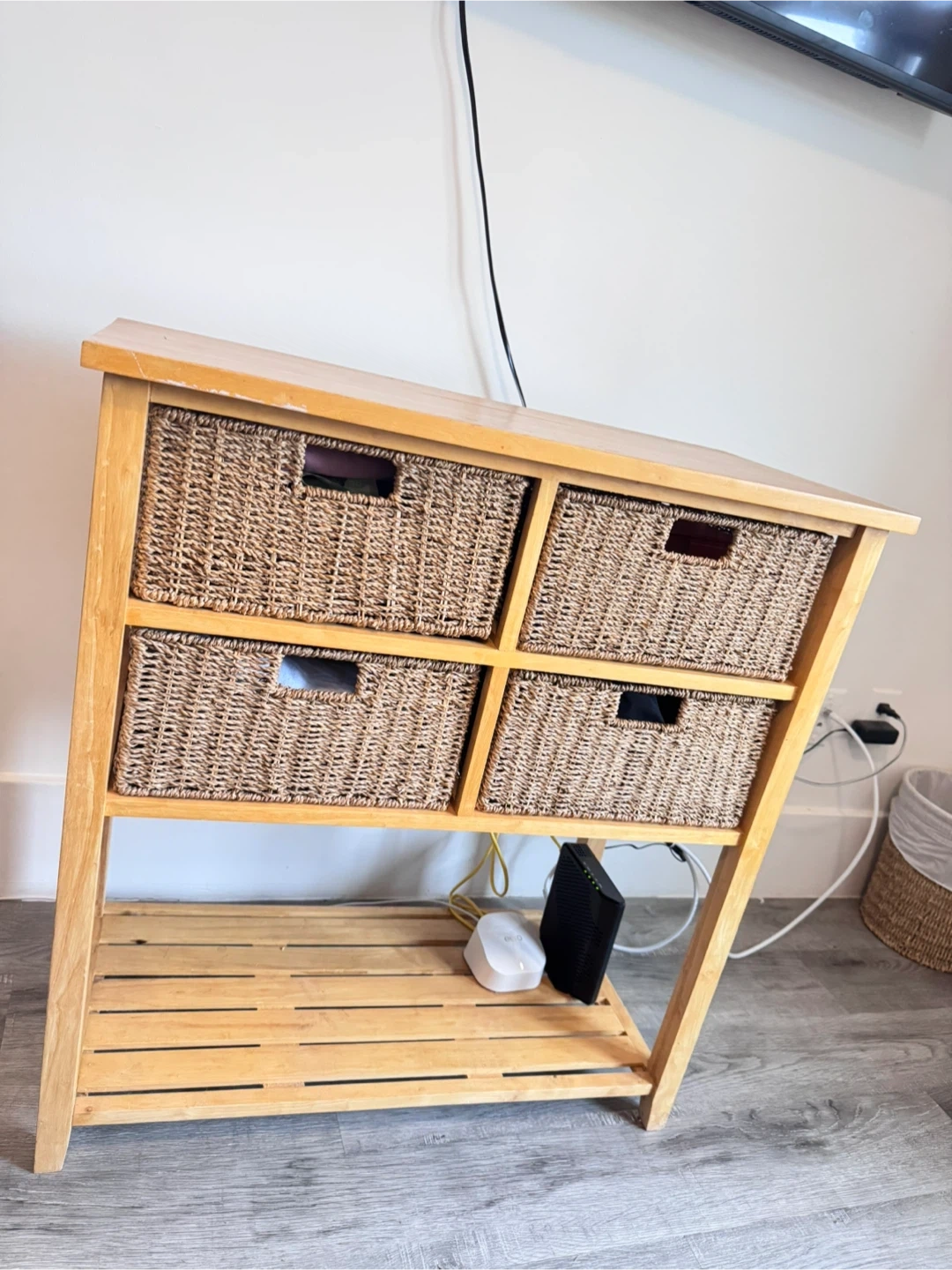 Selling a cute wooden side table featuring wicker baskets! It's perfect for adding a touch of rustic charm to any room. The table measures approximately 15 3/4" wide and 19 3/4" tall, with the top being 13 5/8" wide. It's in great condition and ready for a new home