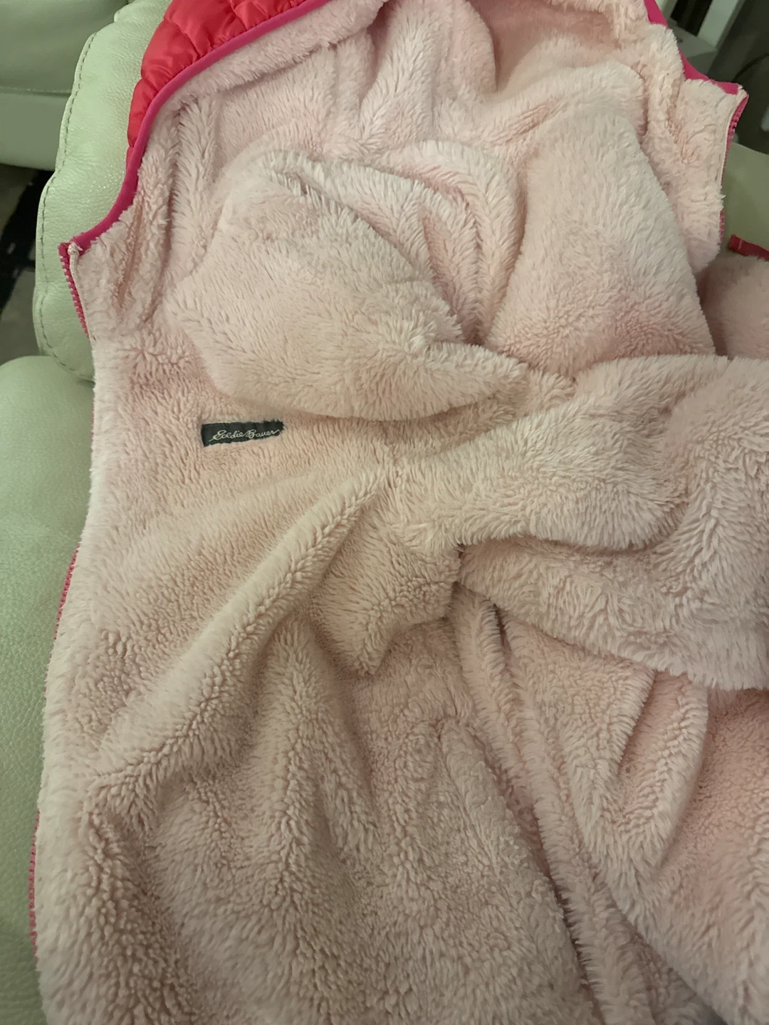 This Eddie Bauer puffer jacket is in great condition and ready for a new owner! It features a vibrant pink and purple ombre design on the outside and a cozy pink fleece lining. Perfect for keeping your little one warm and stylish during chilly weather. Size is M (10-12). Reversible jacket.
