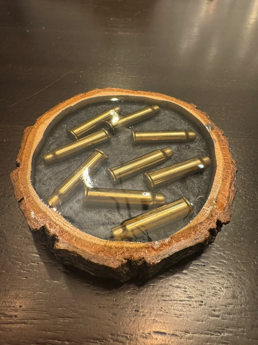 17 HMR bullet casings in case in crystal clear epoxy with a black base