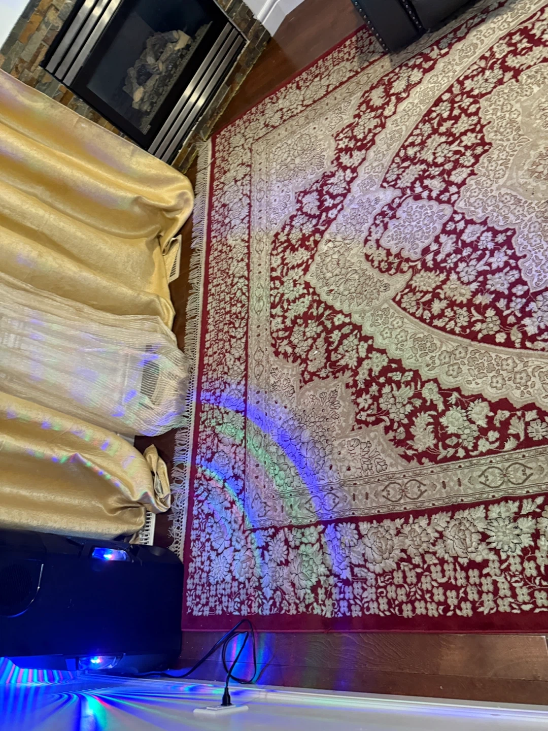 Selling a lovely area rug with a red and beige floral pattern! It measures approximately 3.39 meters by 2.42 meters. It would look great in a living room or bedroom