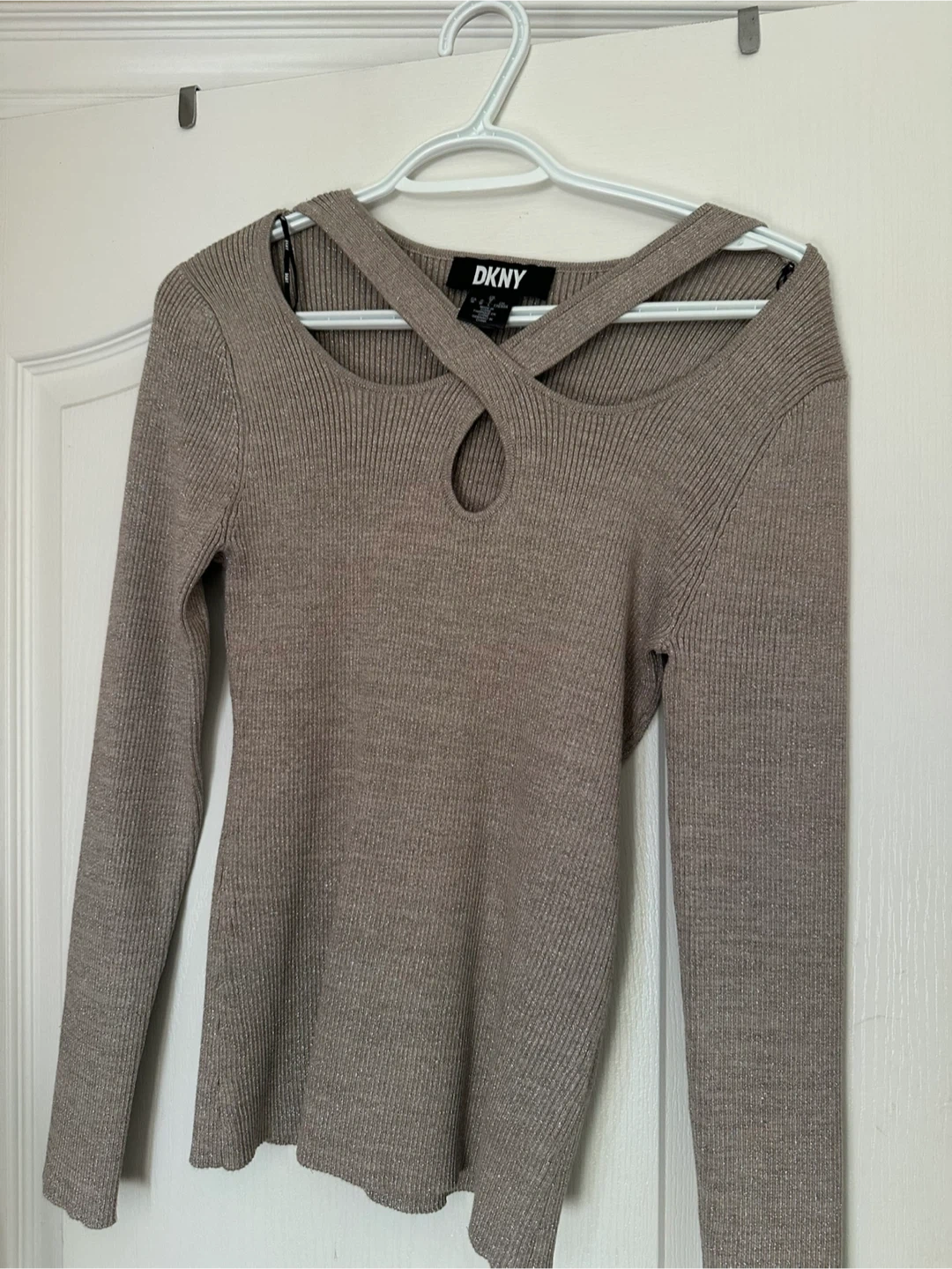 Selling a DKNY long sleeve top in a neutral beige colour. The top features a unique criss-cross neckline detail and a ribbed texture. Perfect for layering or wearing on its own!