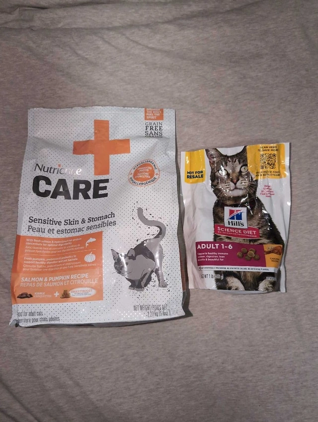 I am offering two bags of cat food, one is a half full bag of Nutrience Care sensitive skin and stomach salmon and pumpkin recipe, and one is a sample size bag of Hill's Science Diet Adult 1-6+. Both are great options for your feline friend! Since both bags have been opened, this is reflected in the reduced price.