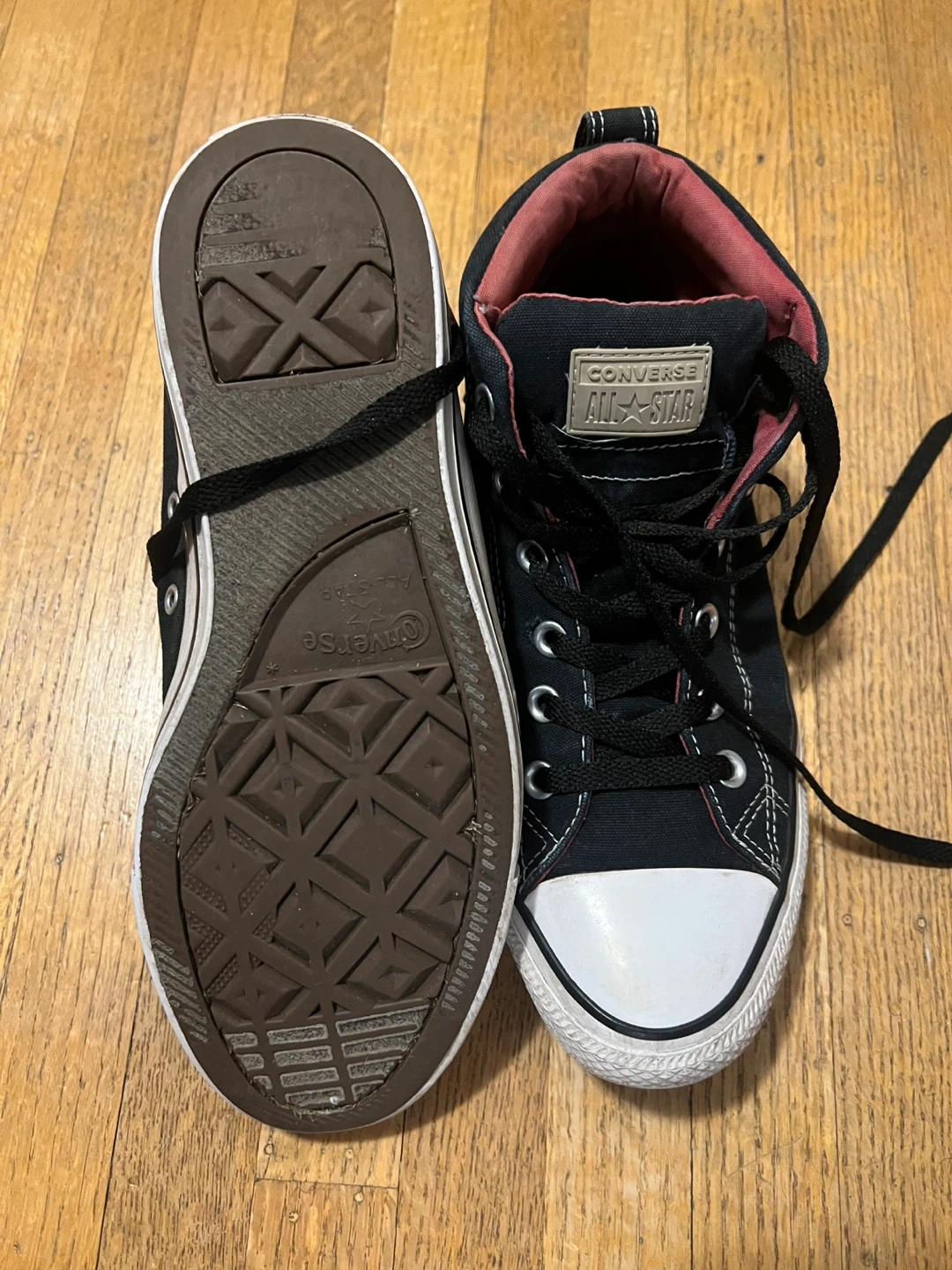Selling a pair of Converse All Star high top sneakers in black. They're in good condition and ready for a new home. Size is US 8.