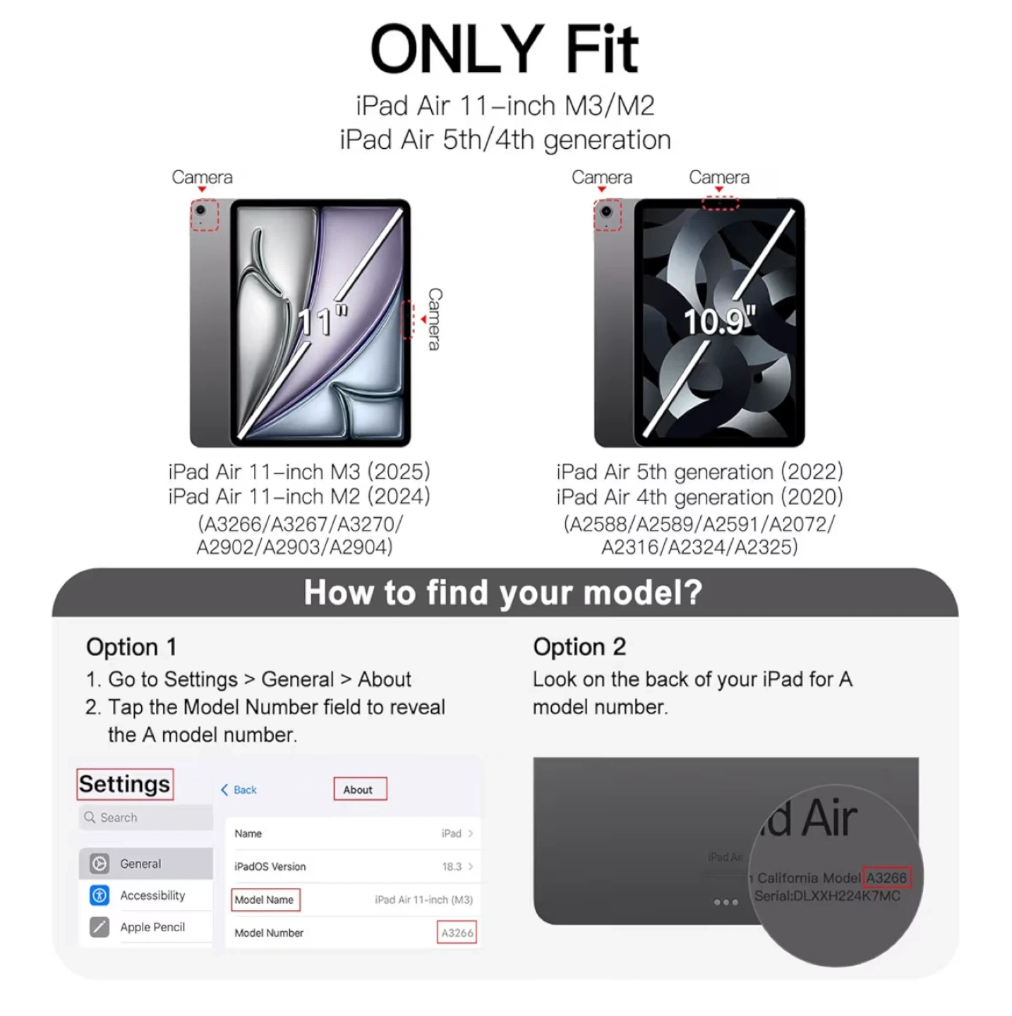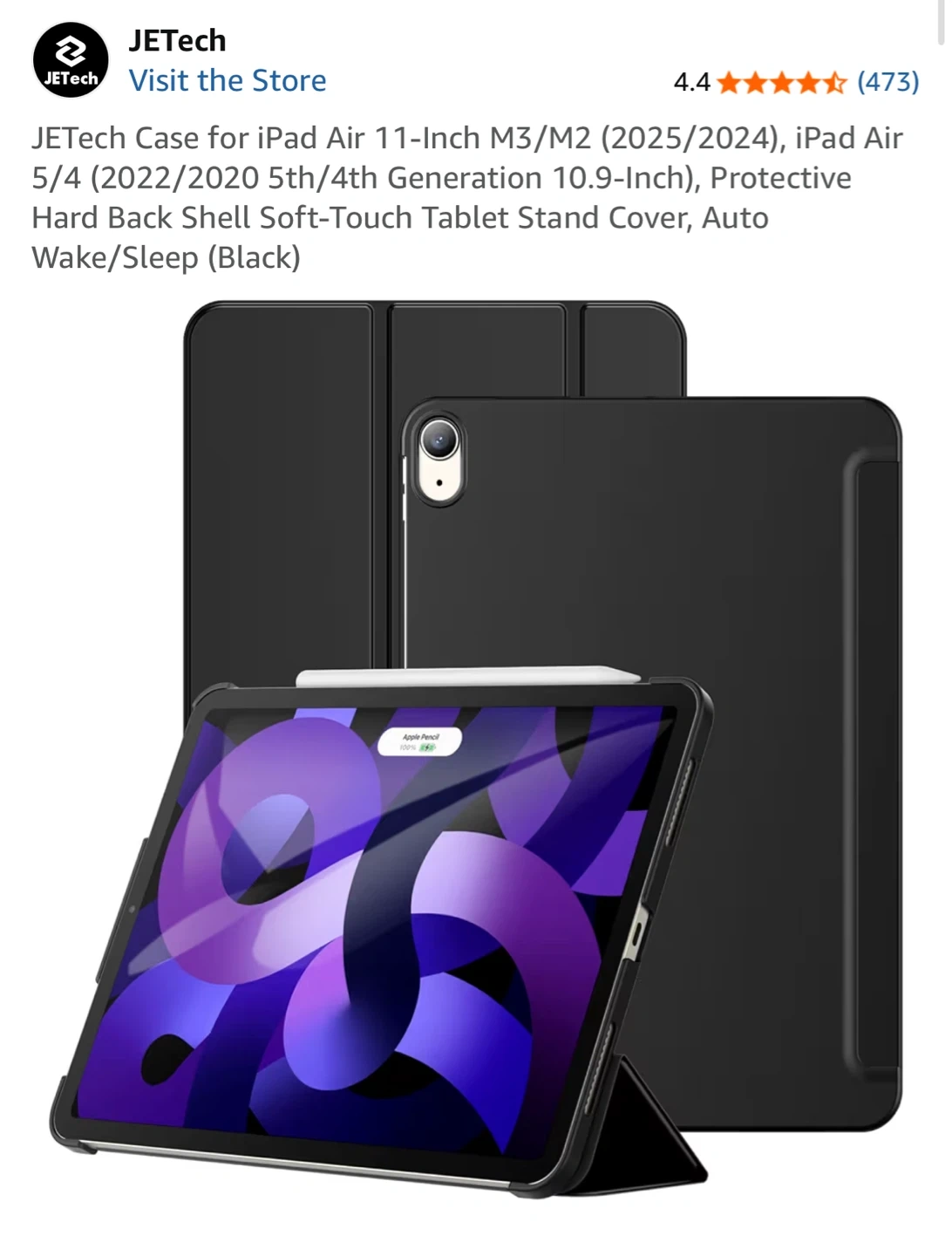 Looking to protect your iPad Air? This JETech case is designed for the iPad Air 11-inch M3/M2 (2025/2024) and iPad Air 5th/4th Generation (10.9-inch). It features a hard back shell with a soft-touch tablet stand cover. The case also supports auto wake/sleep functionality. It's black, sleek, and provides excellent protection for your device