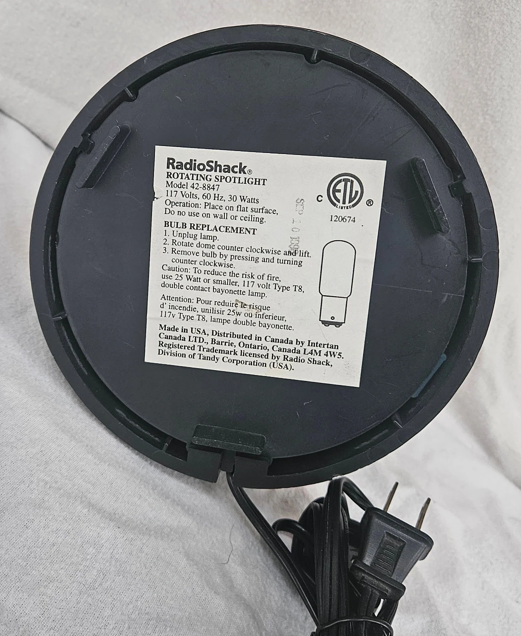 This vintage Radio Shack 7” rotating beacon light features a on/off switch cord.