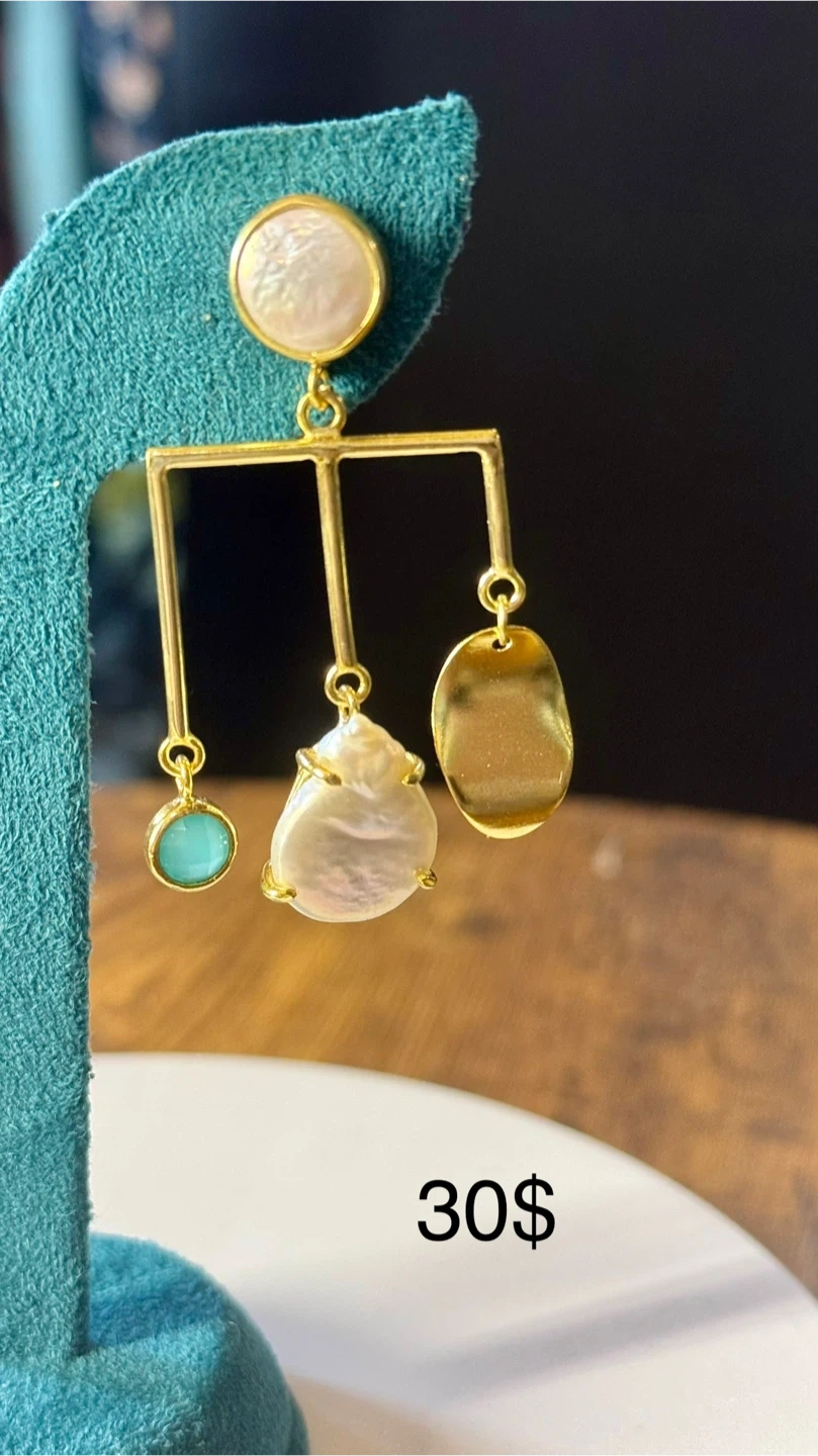 Selling a pair of unique, handmade pearl drop earrings! They feature a gold-tone metal with pearl and turquoise-coloured accents. These earrings are perfect for adding a touch of elegance to any outfit