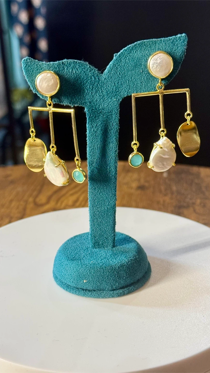 Selling a pair of unique, handmade pearl drop earrings! They feature a gold-tone metal with pearl and turquoise-coloured accents. These earrings are perfect for adding a touch of elegance to any outfit