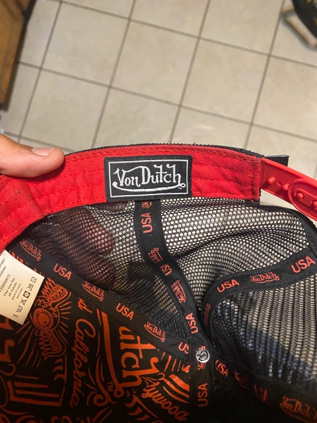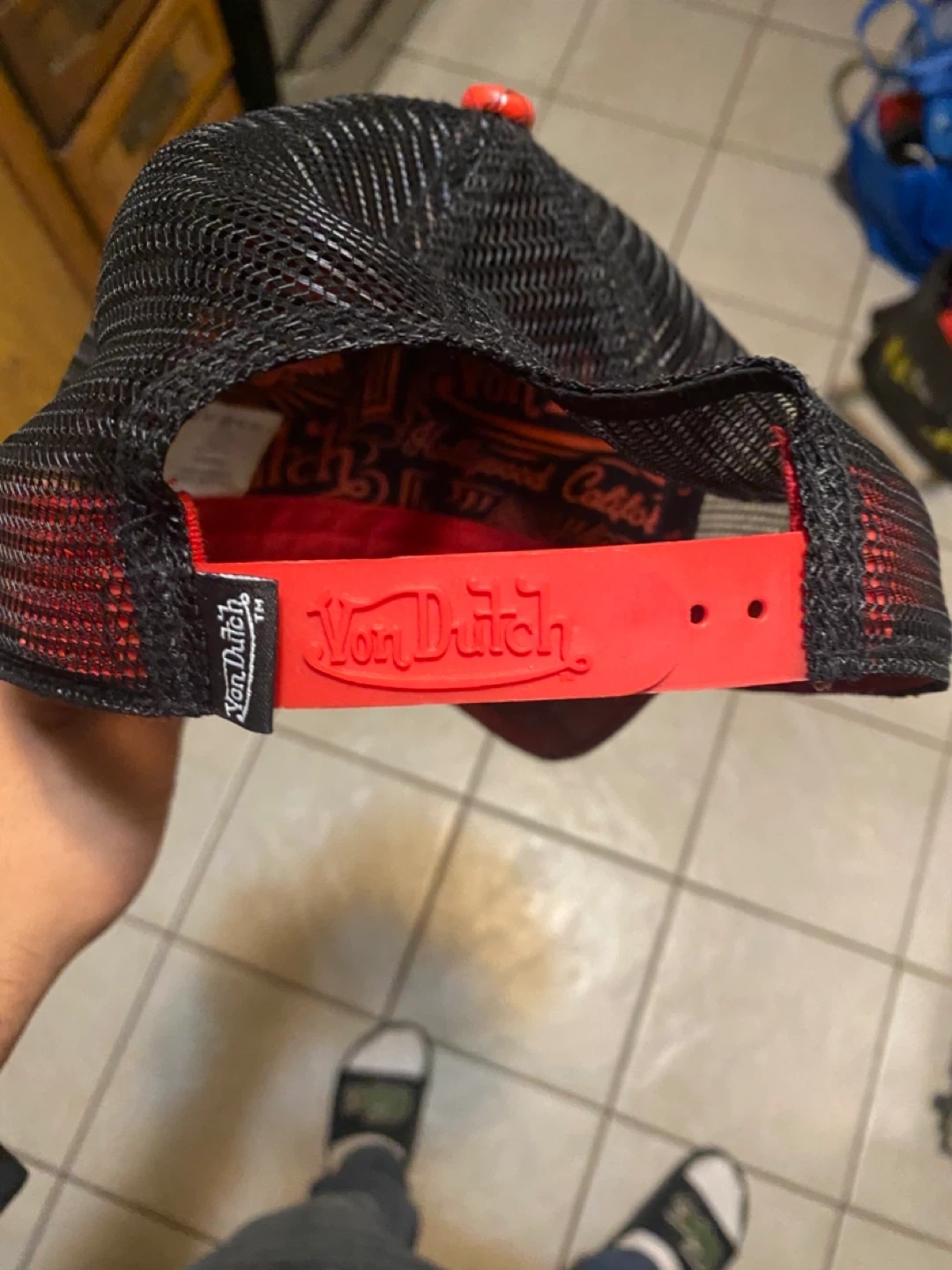 Selling a Von Dutch trucker hat! It features a red snakeskin pattern on the front and a black mesh back. The inside lining has a cool Von Dutch California design. Great for adding a pop of colour to your outfit!
