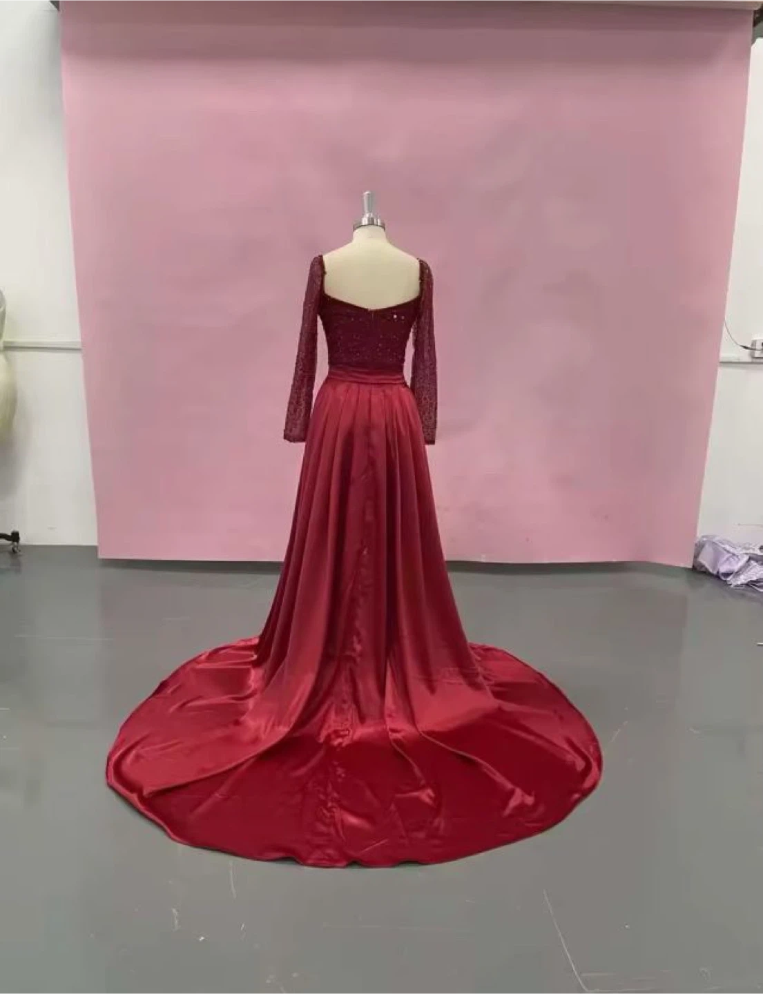 Selling this stunning burgundy formal gown. It’s in perfect condition, no stains, no tears, no missing beads. The dress has a square neckline, sheer beaded sleeves, a fitted sparkly bodice, and a dramatic satin train that looks unreal in photos.