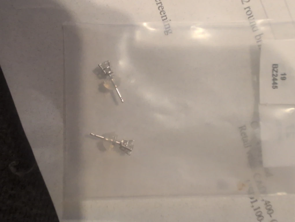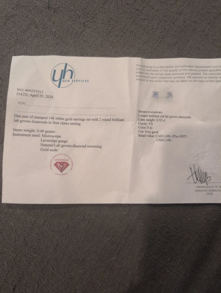 Selling a pair of stamped 14k white gold earrings, each set with 2 round brilliant lab-grown diamonds in a four-claw setting. The total weight is 0.40 grams.
