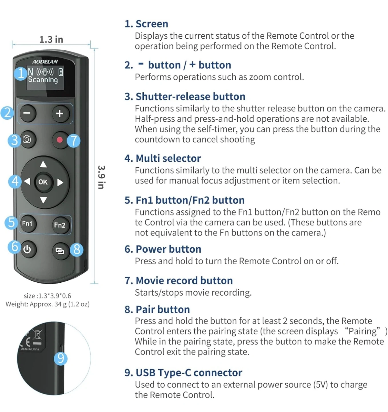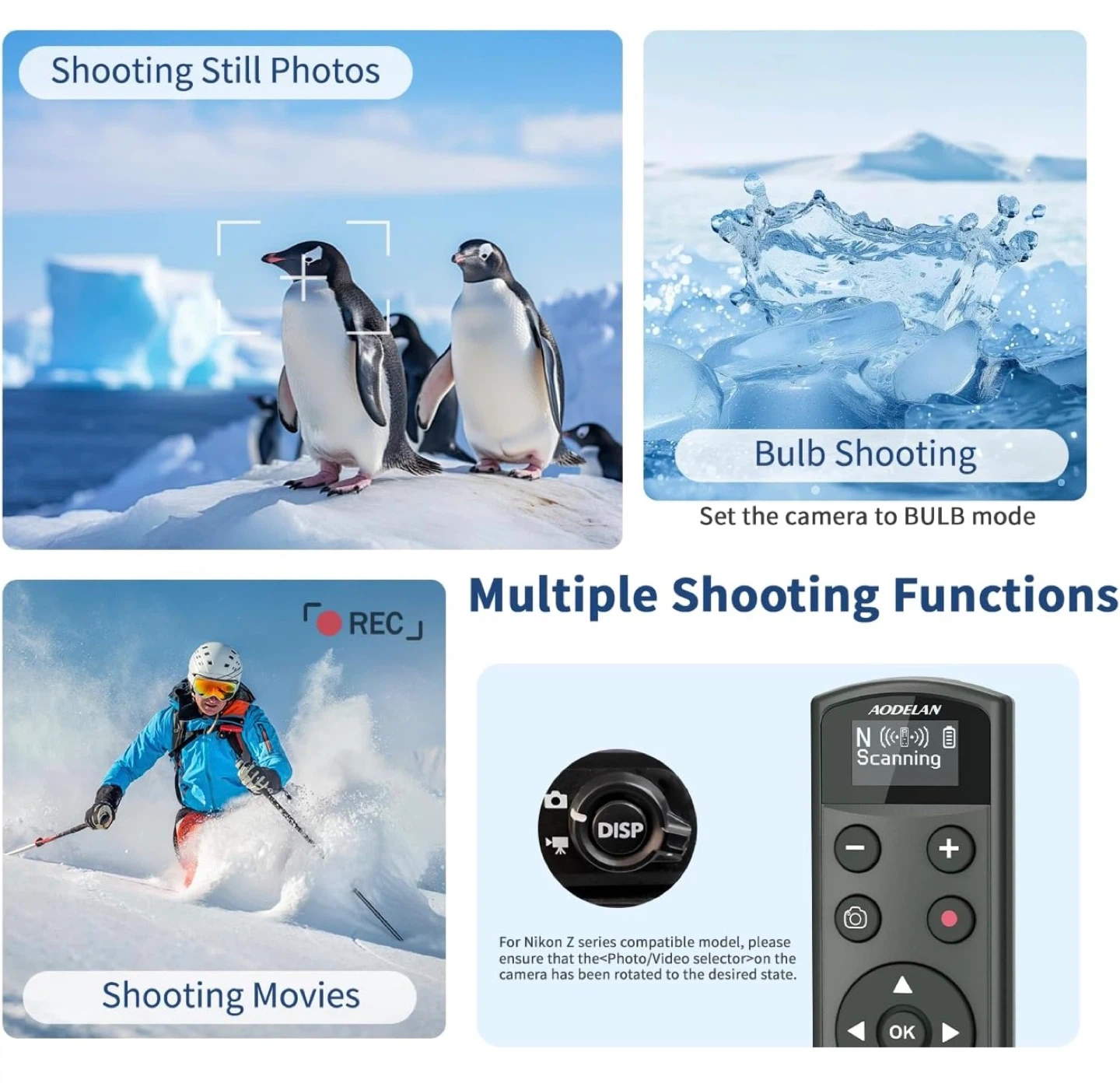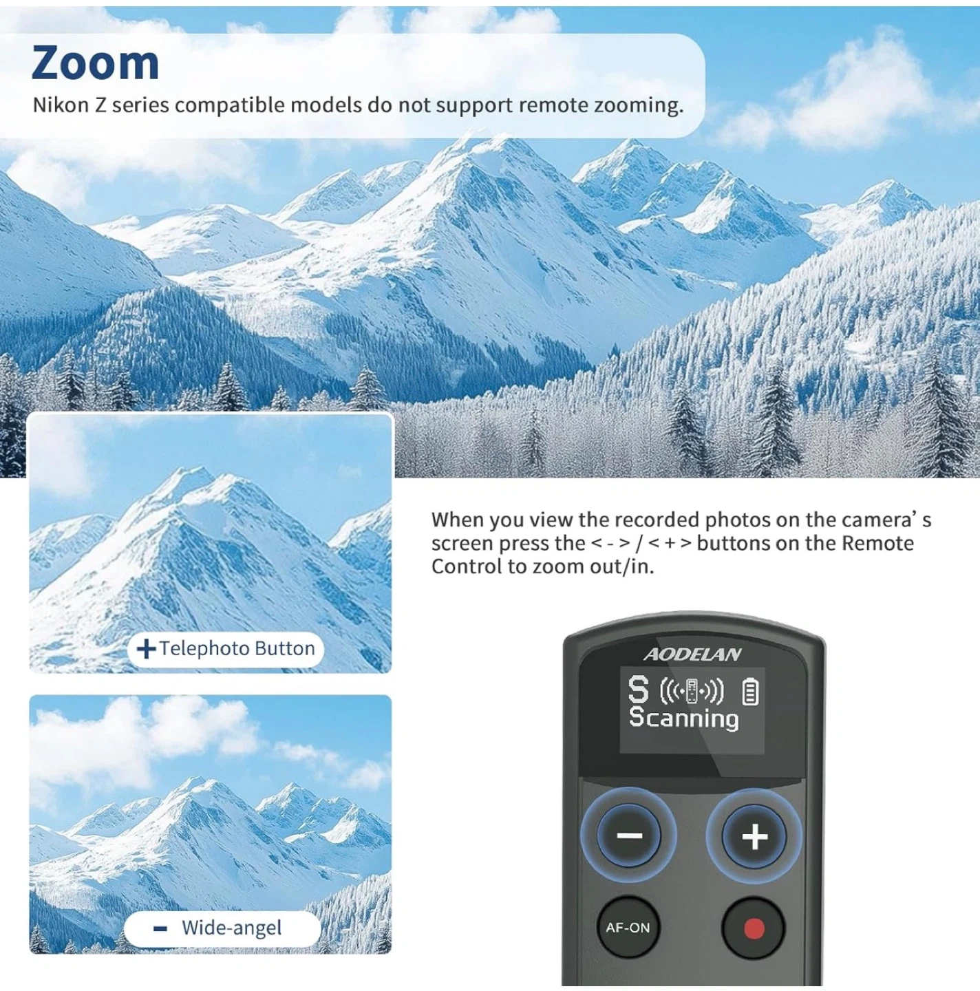 Selling an AODELAN wireless remote control for Nikon cameras. It's in great condition and comes with a USB charger. It's compatible with COOLPIX P1000, P1100, P950, B600, A1000, Z50, Z30, Z fc, Z6 II, Z7 II, Z5, and replaces Nikon ML-L7 (Black). It has a rechargeable battery that lasts about 10 hours.