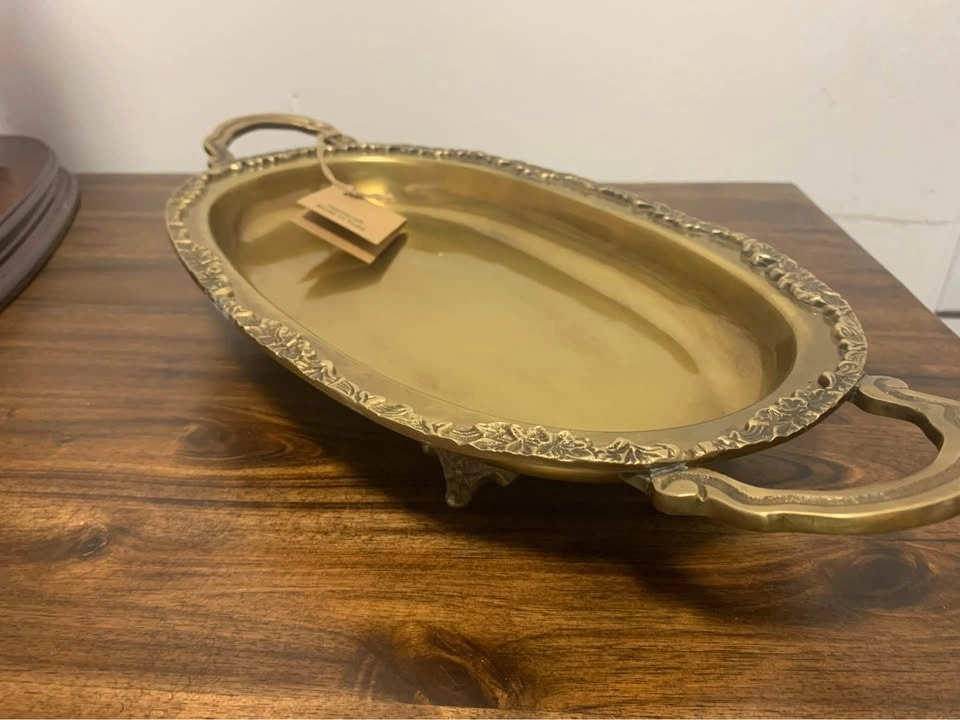 Beautiful vintage solid brass serving tray with ornate floral edging and sturdy double handles. Handcrafted in India.