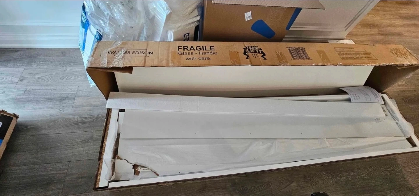 Bought new, never been used or assembled. Small break in the corner of the back cover that faces the wall hence discounted price. Very sturdy tv stand. For pick up only please.