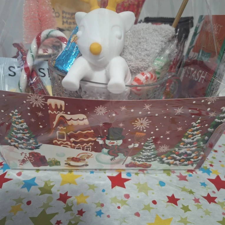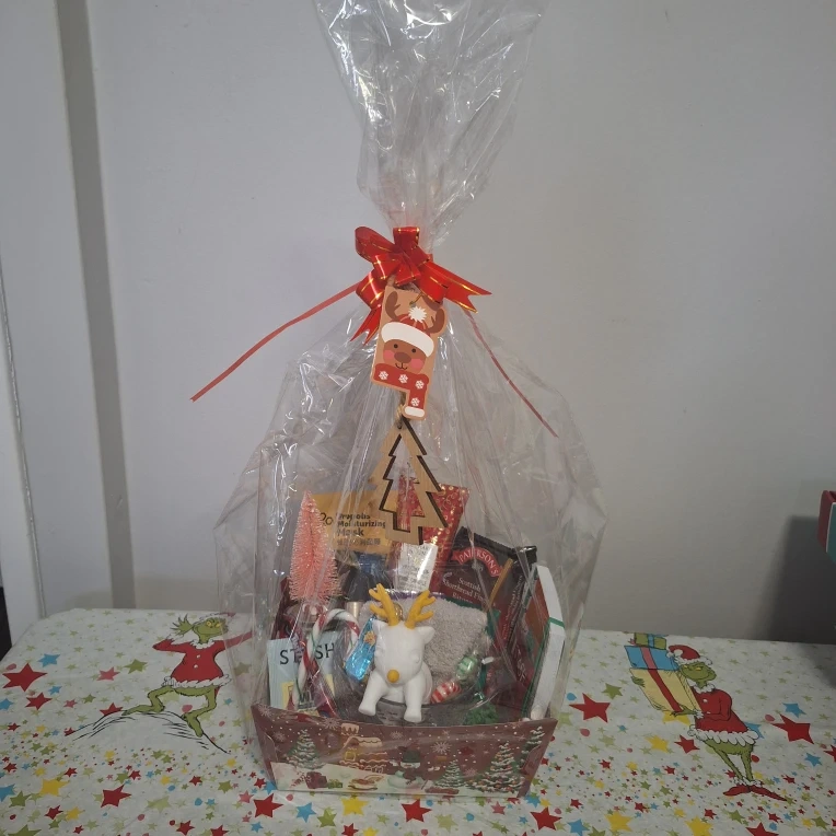 I have a festive holiday gift basket filled with various treats and goodies! It includes items like shortbread fingers, Orchard & Vine products, and other fun surprises. Perfect for a Christmas gift!
