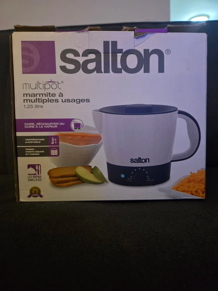 Selling a Salton multipot with a 1.25 litre capacity. It's perfect for boiling water, cooking noodles, rice, macaroni and cheese, reheating soups, and more! It comes with a removable lid with an integrated strainer, a noodle and steamer basket, and an egg holder. The box is included