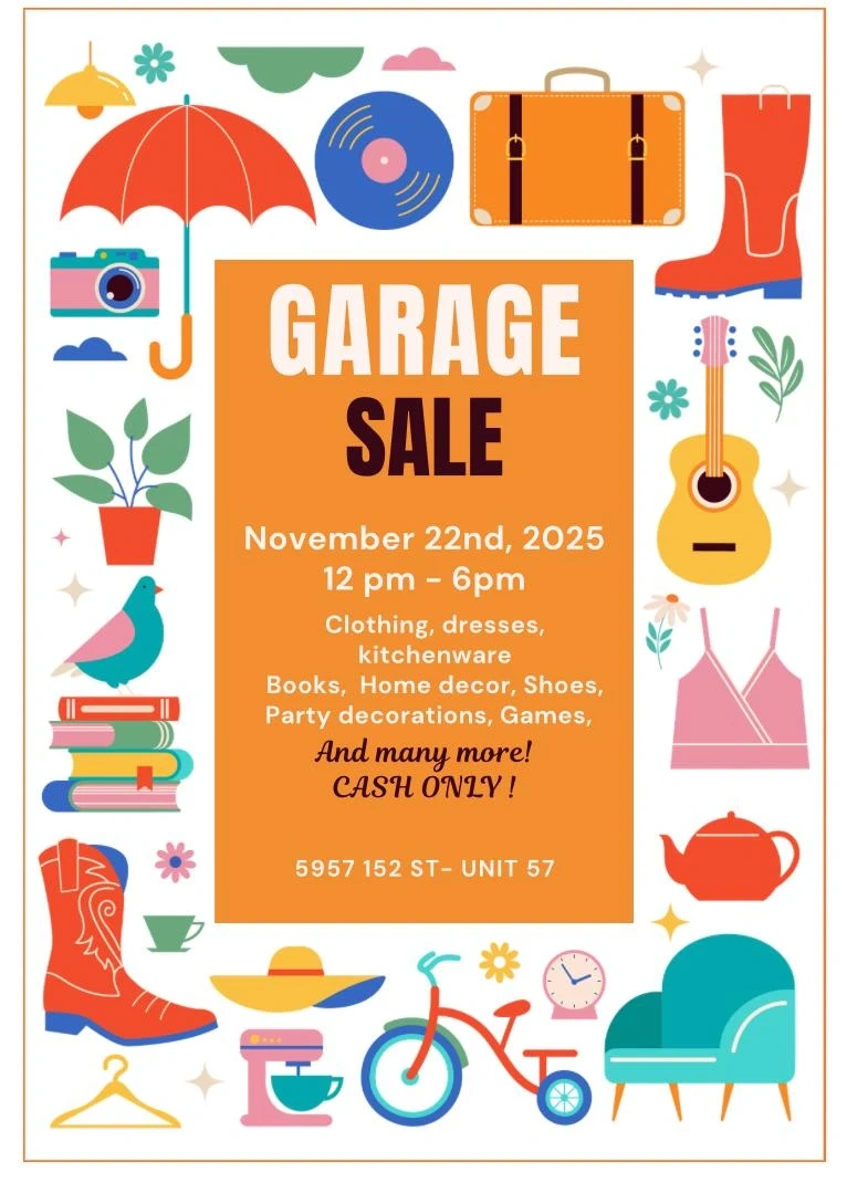 Come check out our garage sale on November 22nd, 2025, from 12 pm to 6 pm! We'll have clothing, dresses, kitchenware, books, home decor, shoes, party decorations, games, and much more. Cash only!