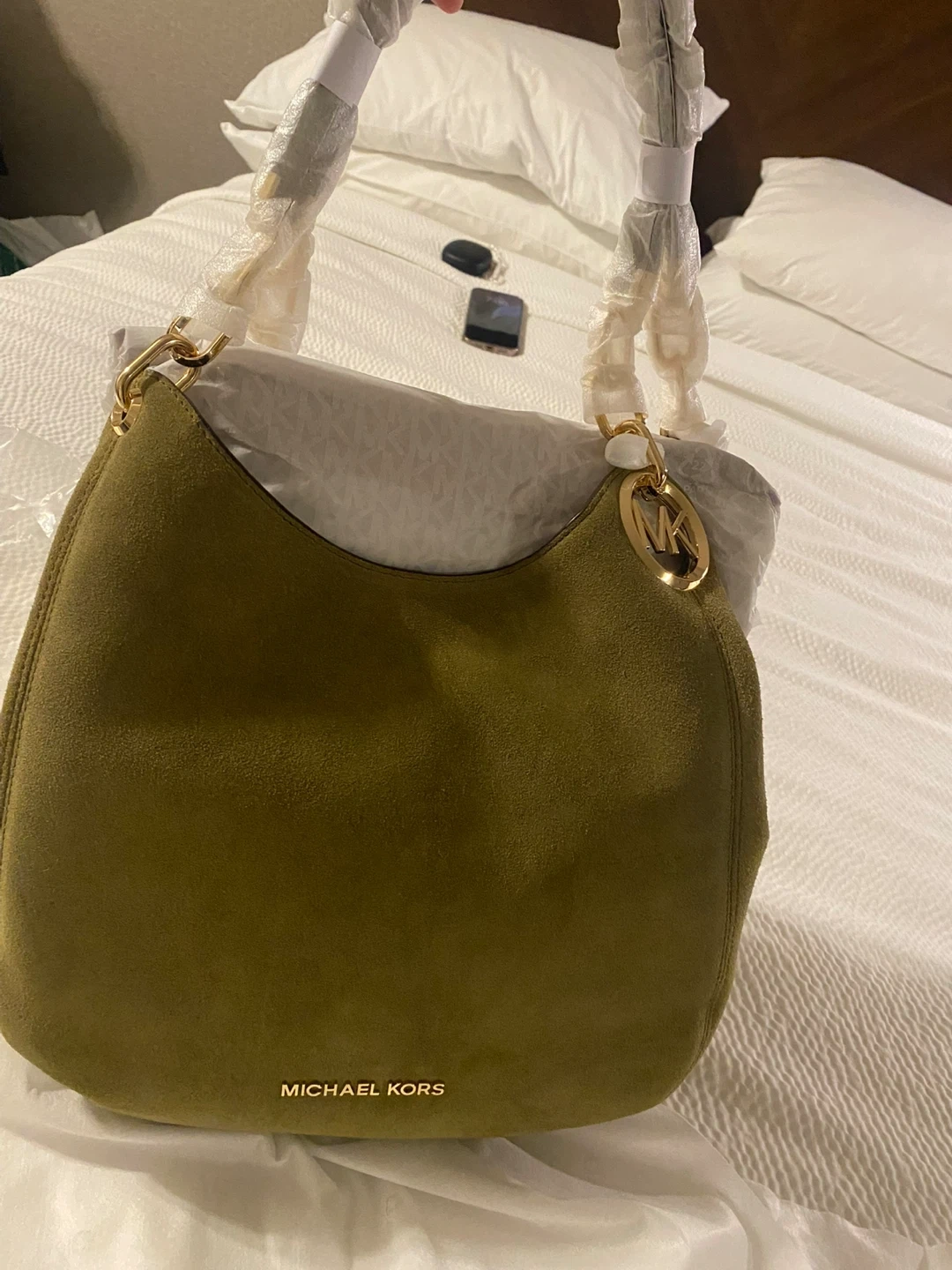 Selling a beautiful Michael Kors shoulder bag in olive green! It's in great condition and ready for a new home. The bag features the classic MK logo and is made with quality materials. Perfect for everyday use or a night out!