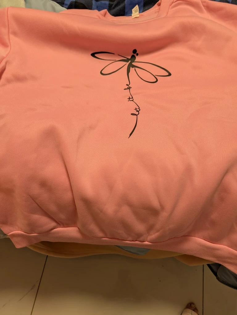 I'm selling a comfy pink crewneck sweatshirt with a unique dragonfly and face design! It's in great condition and perfect for adding a touch of whimsy to your wardrobe