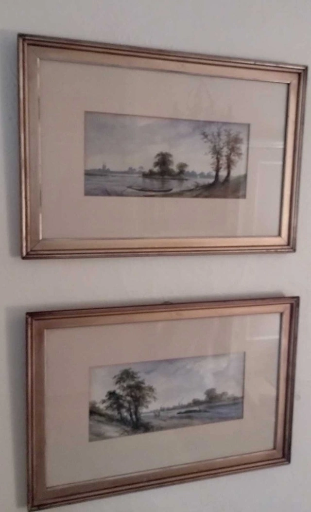 These are two used water color paintings, each featuring serene landscape scenes framed in gold. The top painting showcases a waterscape with trees, while the bottom one depicts a field with trees under a cloudy sky. They add a touch of elegance to any room. * Framed and ready to hang * Landscape scenes * Gold frames I'm pricing these at $75. If you're seeing this ad, the paintings are available.