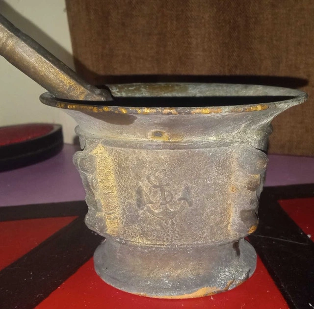 This is a used bronze pestle and mortar, perfect for grinding herbs and spices. It has a vintage look and feel that adds a rustic touch to any kitchen or collection. This item shows signs of wear consistent with its age and material. The bronze has a rich patina, and there are some minor imperfections that enhance its antique charm. Features: - Durable bronze construction - Classic design - Ideal for grinding herbs, spices, and more If the ad is up, it's still available!