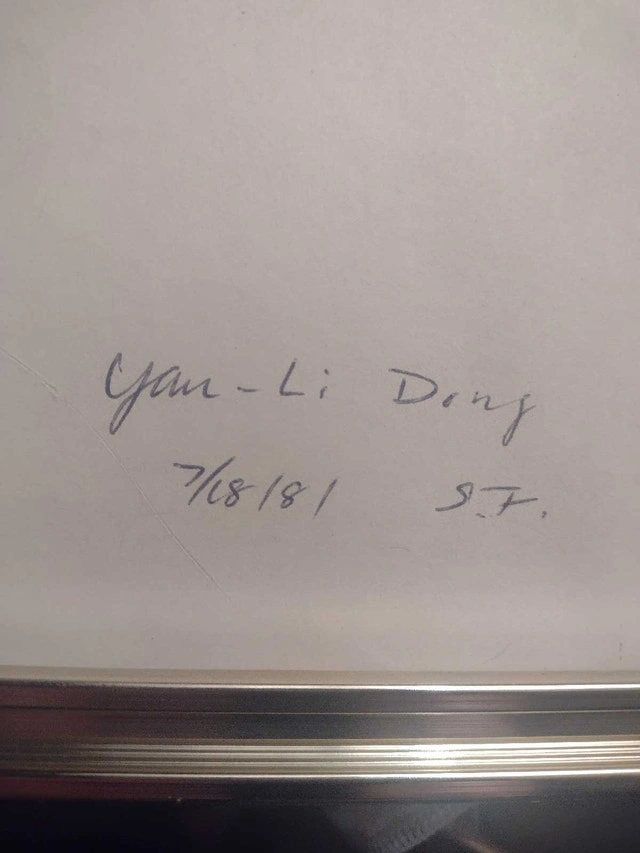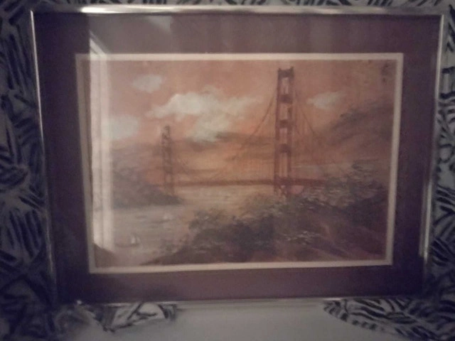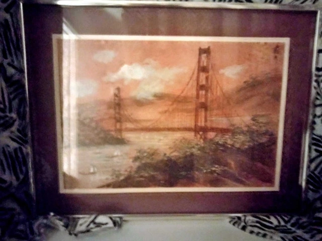 This is a used painting by Yan-Li Dang, featuring the Golden Gate Bridge. The painting is signed and dated 7/18/81, S.F. It's a unique piece that captures the beauty of San Francisco's iconic landmark. This painting is a treasure.