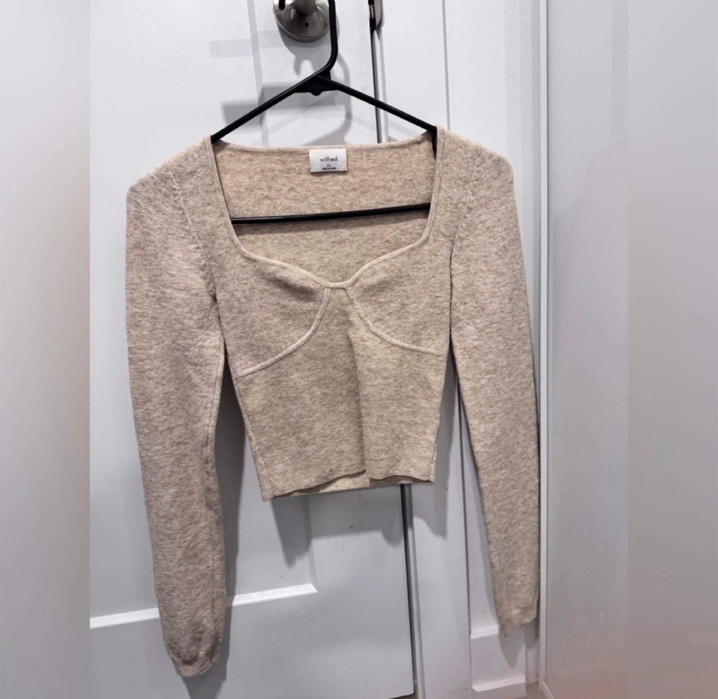 Selling a Wilfred Lyssa sweater in a size small. It's in great condition. The sweater features a flattering sweetheart neckline and a comfortable fit.