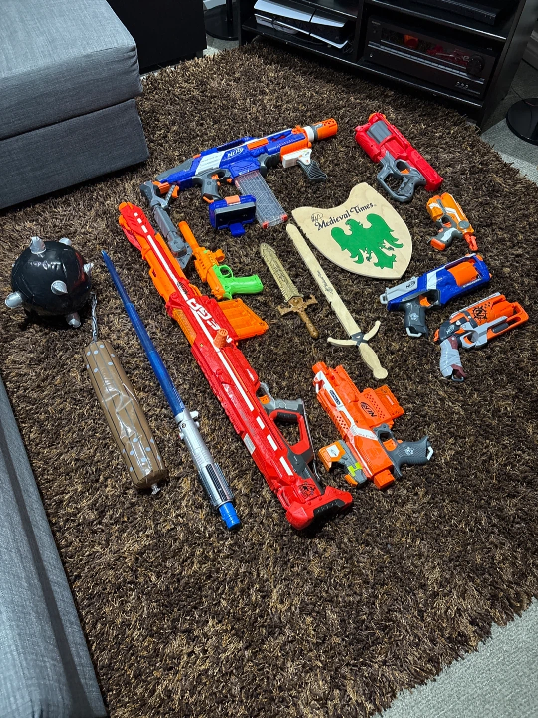 Selling a bundle of Nerf blasters in various sizes and colours! Also included is a Medieval Times shield. Great for some fun battles and imaginative play!