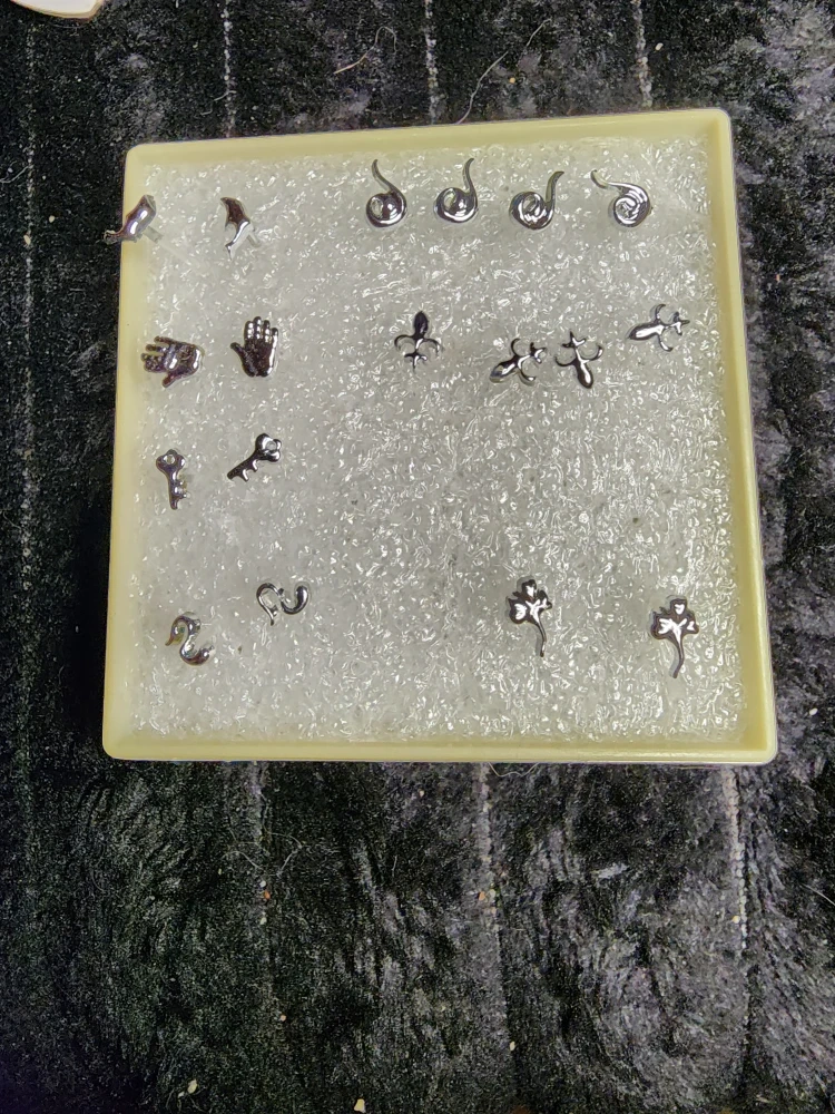 snakes, hands, and fleur-de-lis. Perfect for adding a little something to your everyday look 18 pcs will include the holder $1 each or all for $14