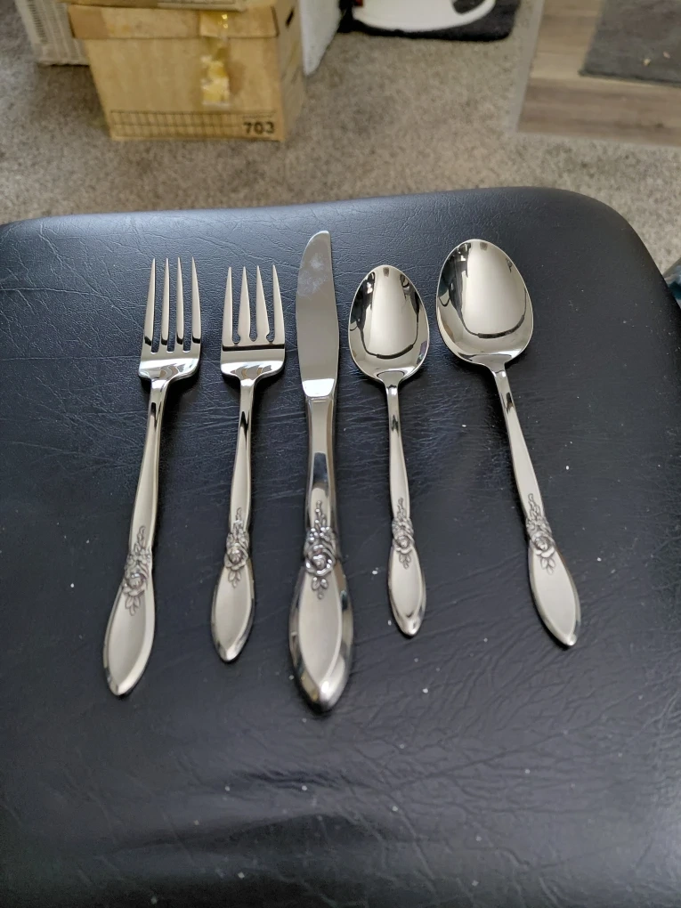I have a set of 5 pieces of vintage silverware for sale! They are in good condition and have a beautiful floral design on the handles. Perfect for adding a touch of elegance to your table setting.