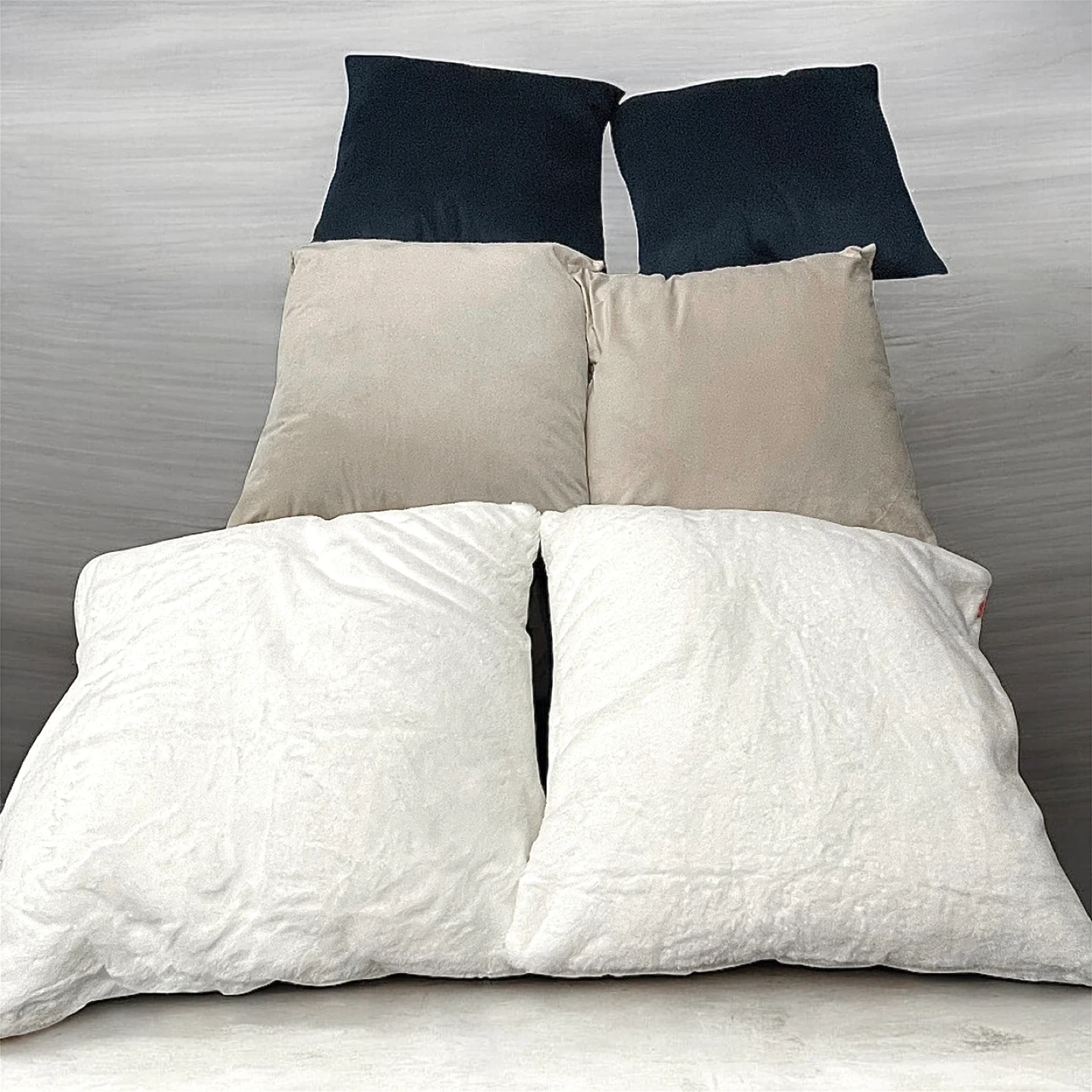 There are two navy blue pillows, two beige pillows and two white pillows. They're in new condition and would look great on a couch or bed. Originally paid $20+ for each.