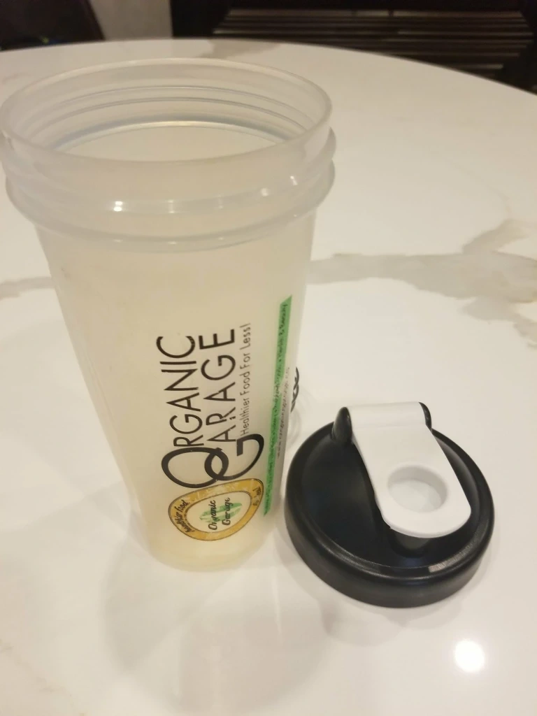 Organic Garage shaker bottle! It's perfect for mixing your protein shakes or smoothies on the go.