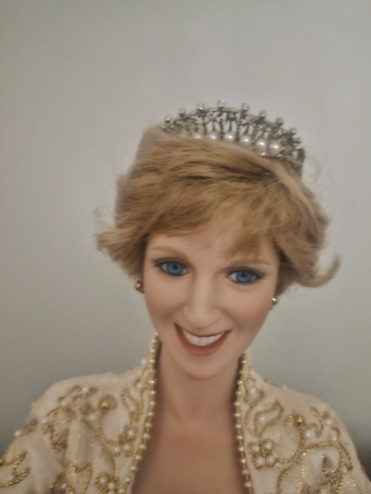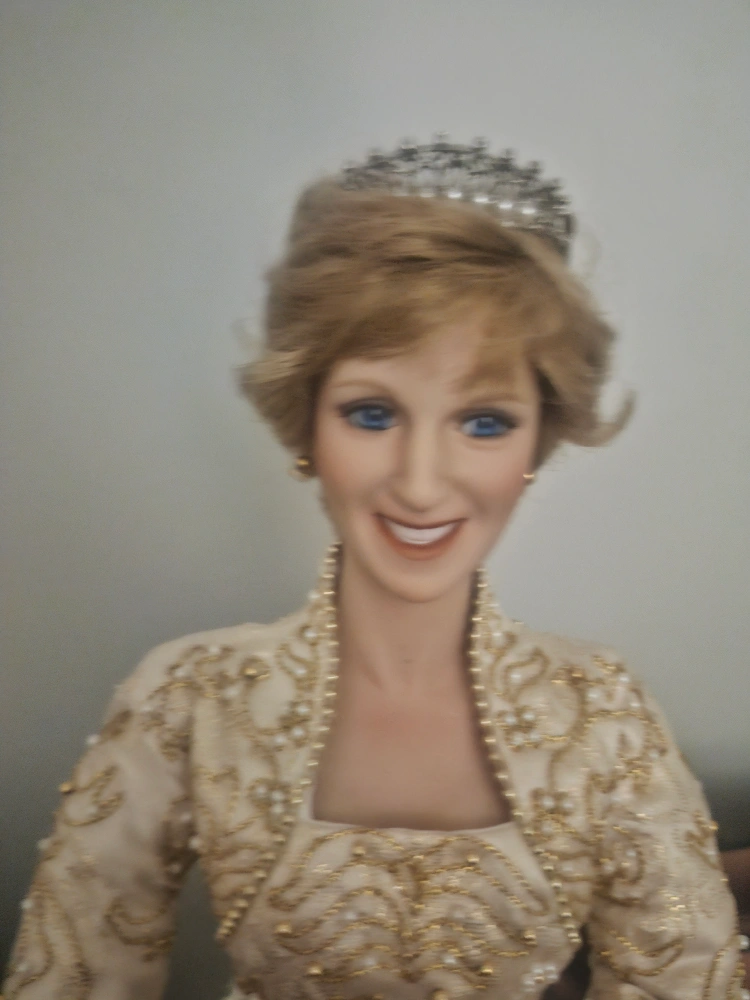 This is a beautiful Princess Diana porcelain doll. The doll is wearing a white dress and a gold jacket. It's in excellent condition and would make a great addition to any collection