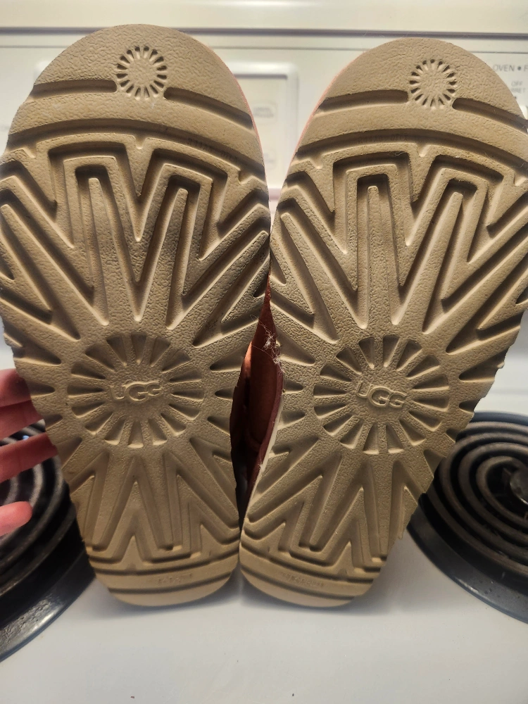 Selling a pair of UGG ladies boots in a lovely pink colour! They are a size 8. These boots are perfect for keeping your feet warm and cozy during the colder months. They have some signs of wear, but are still in good condition for everyday use