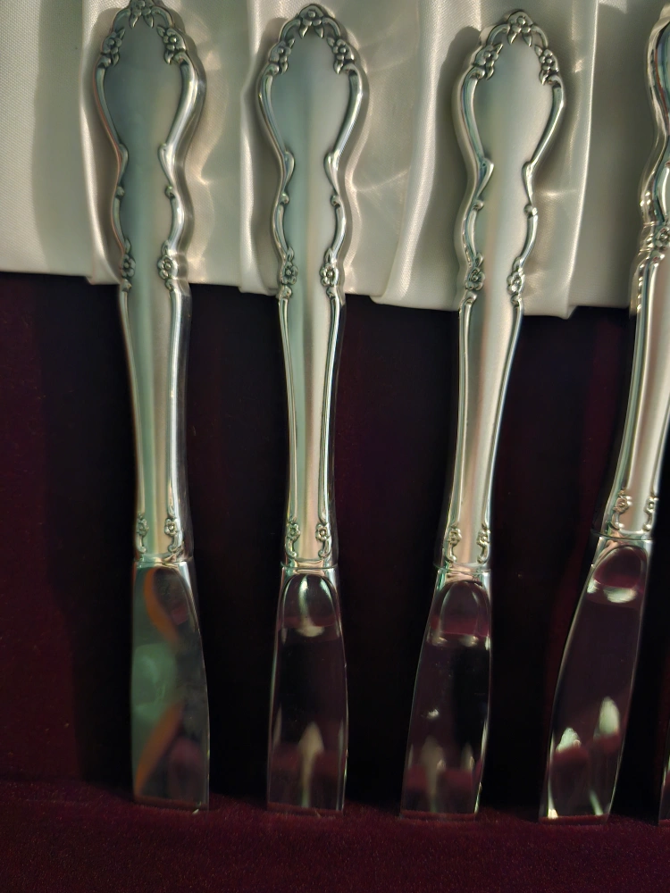 Selling a vintage silverware set, complete with a wooden storage box. The set includes knives, forks, and spoons, all neatly arranged in a velvet-lined interior. Perfect for adding a touch of elegance to your dining experience!