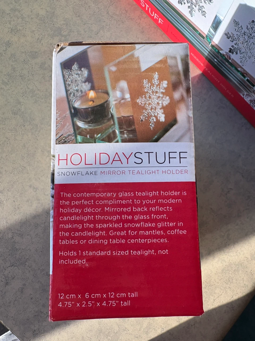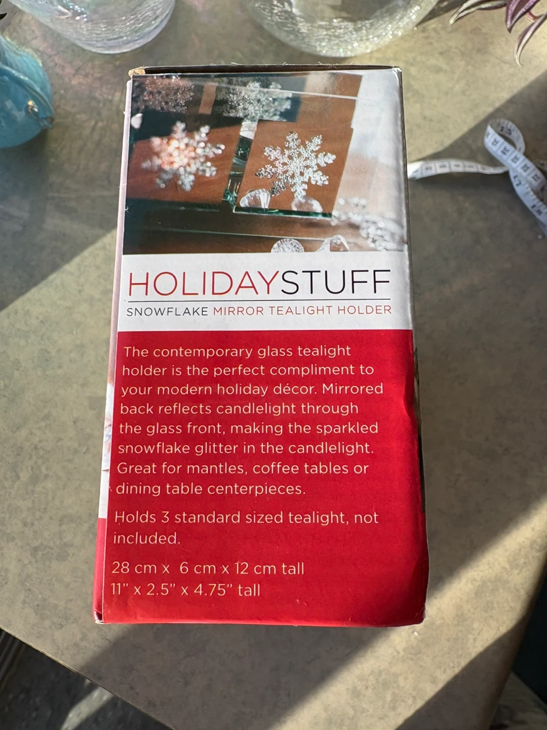 New! Selling a set of 3 Holiday Stuff snowflake mirror tealight holder! The contemporary glass tealight holder is the perfect compliment to your modern holiday decor. Mirrored back reflects candlelight through the glass front, making the sparkled snowflake glitter in the candlelight. Great for mantles, coffee tables or dining table.