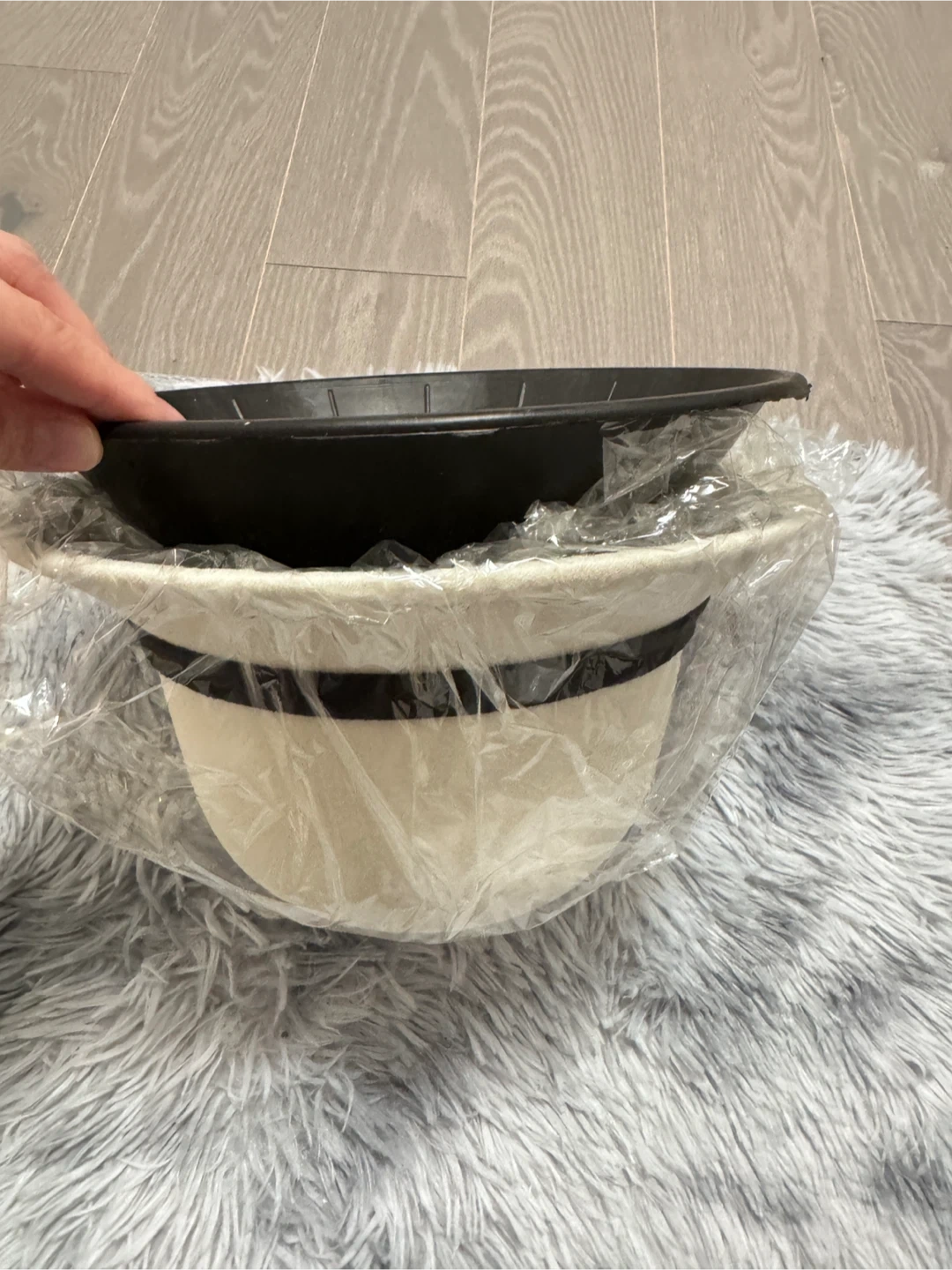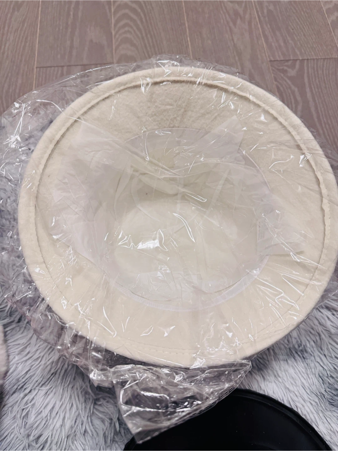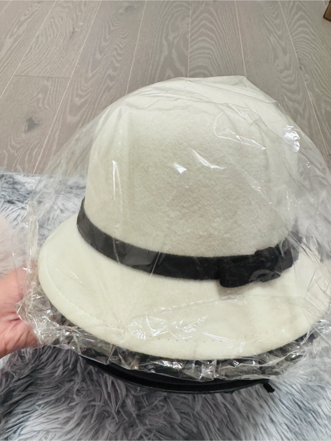 Selling a brand new, cream-coloured cloche hat! It features a stylish black ribbon accent. Perfect for adding a touch of vintage charm to any outfit!