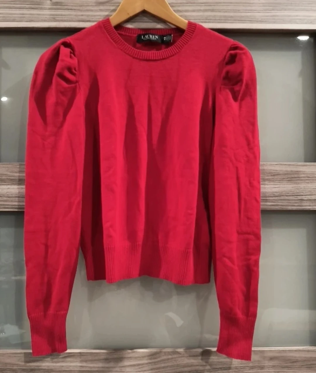 Selling a Ralph Lauren sweater in a vibrant red color! It features stylish puff sleeves and is a size medium petit. This sweater is perfect for adding a pop of color to your wardrobe and staying cozy.