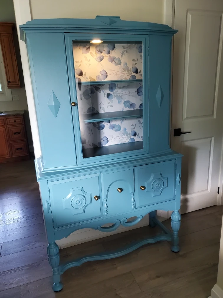 Selling a beautifully refinished china cabinet. The light blue colour gives it a fresh, modern look while maintaining its classic charm. It features glass shelves and a lovely floral wallpaper backing. Perfect for displaying your favourite dishes or collectibles!