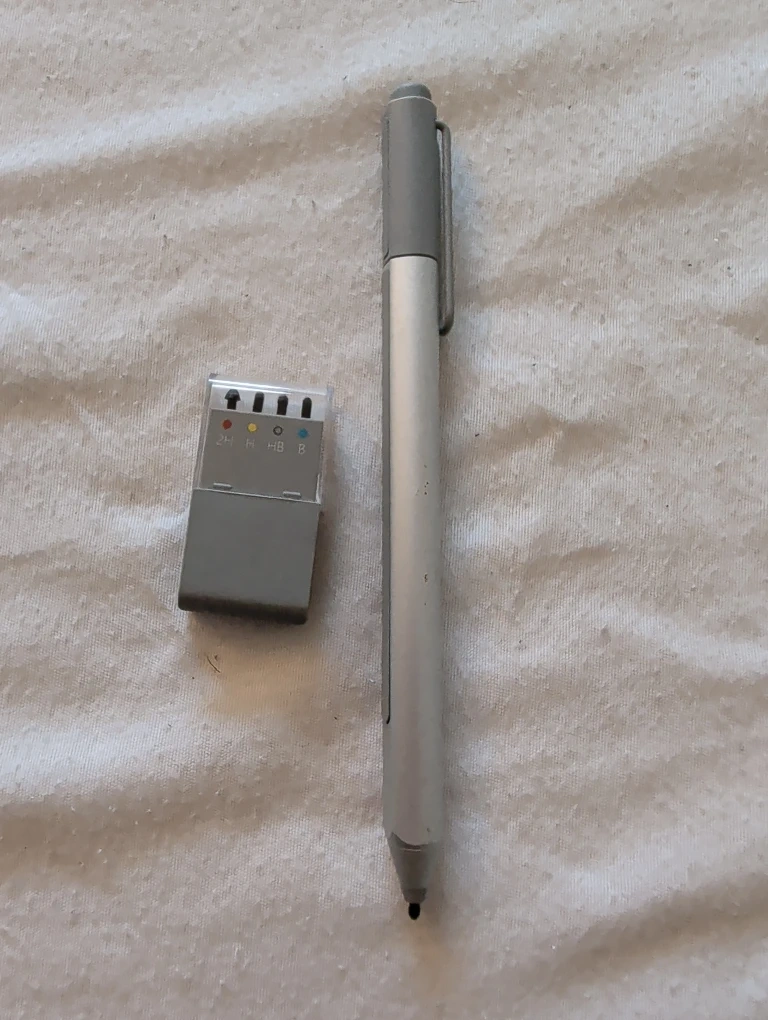 Selling a Surface Pen along with a tips kit! It has some signs of use but is still in good working condition. The tips kit includes different types of tips, labelled 2H, H, HB, and B.