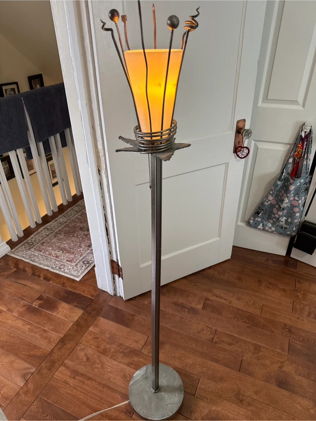 Selling a unique floor lamp with a metal and glass design. It's in great condition and would add a distinctive touch to any room. The lamp features a textured metal base and a warm, glowing glass shade. Goes with rustic, industrial or eclectic designs. Bulb included. Has a pull chain for easy on and off