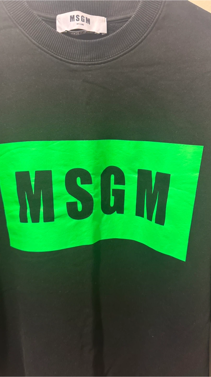 Selling a gently used MSGM sweatshirt in size XL. It's black with a bright green MSGM logo on the front. The material is soft and comfortable, perfect for everyday wear!