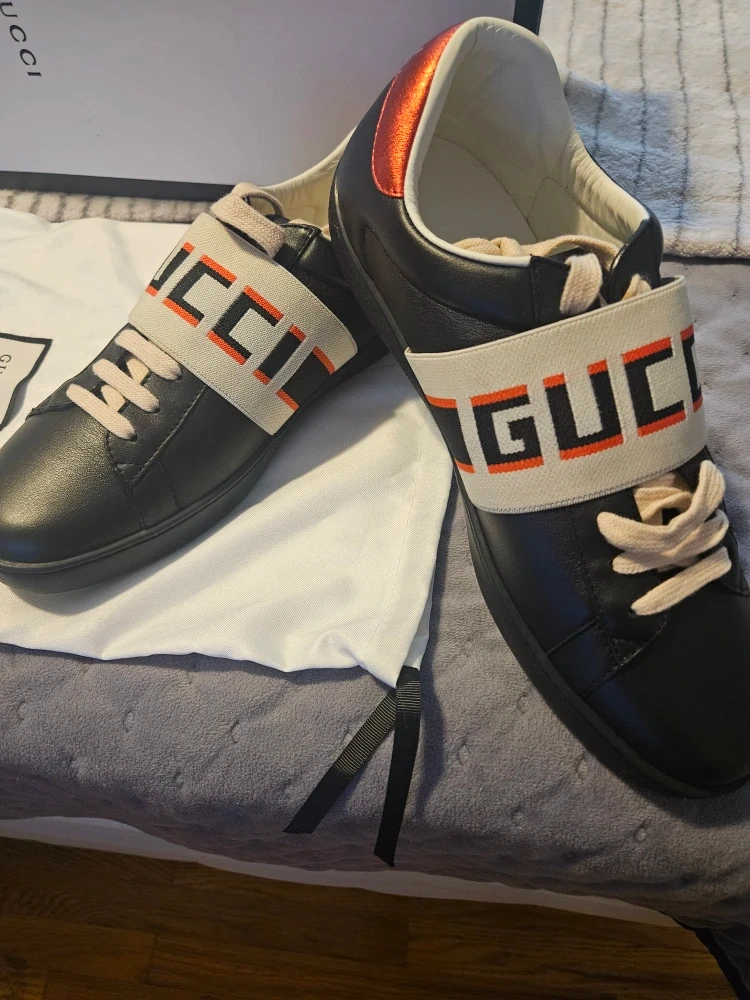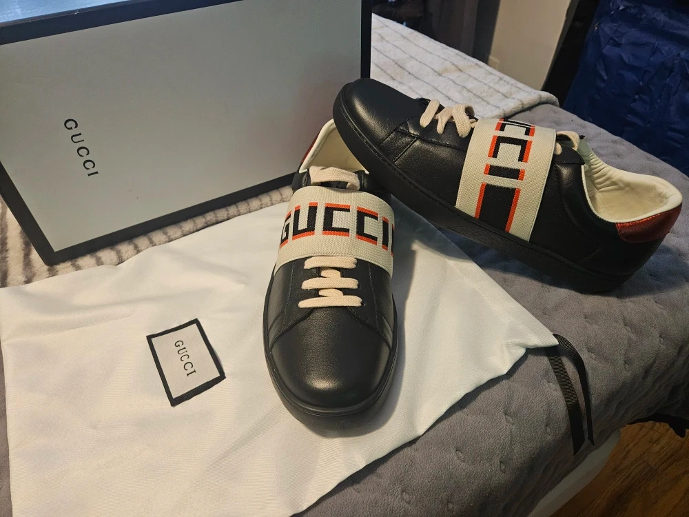Selling a pair of Gucci black leather sneakers. These stylish sneakers feature the iconic Gucci logo strap. They come with the original box and dust bag. Perfect for adding a touch of luxury to your everyday look!