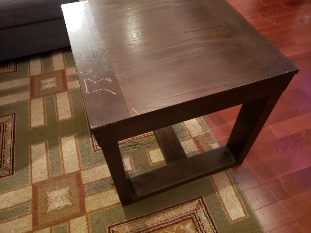 Selling a dark brown wood end table. It has some minor scratches on the top surface, as shown in the photos. This sturdy table would be great as a bedside table or in a living room