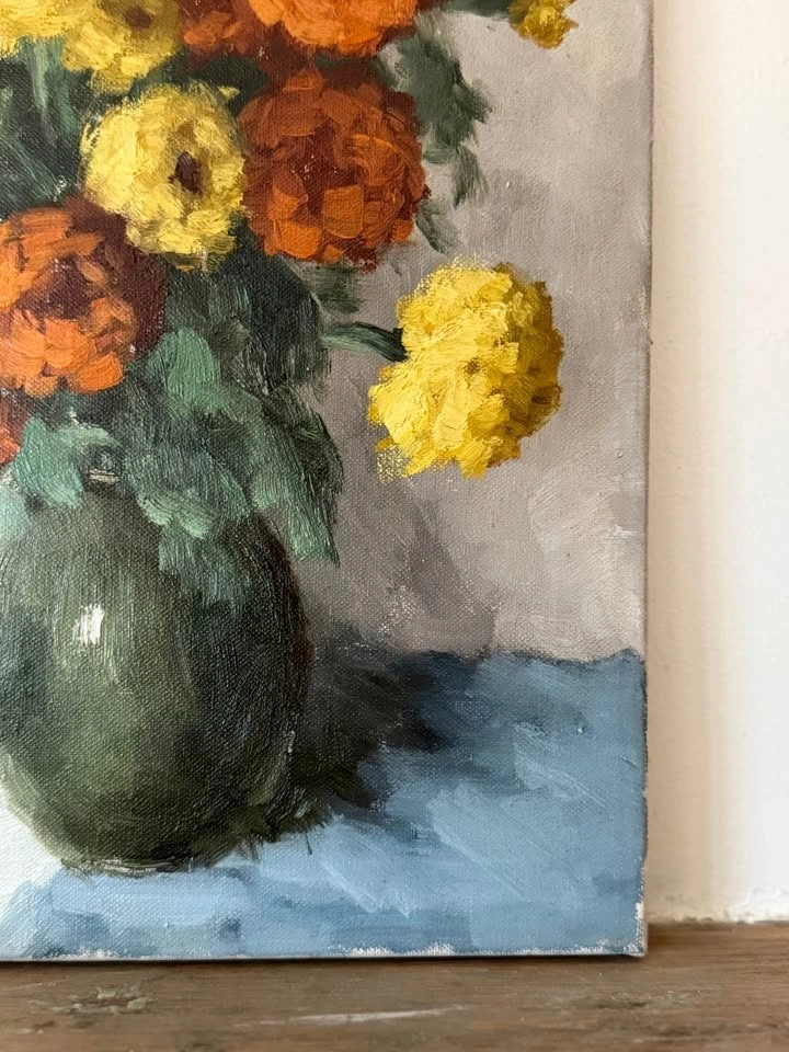 Vintage Original Oil Painting on Canvas of a stunning bouquet of orange and yellow marigolds in a dark green vase.