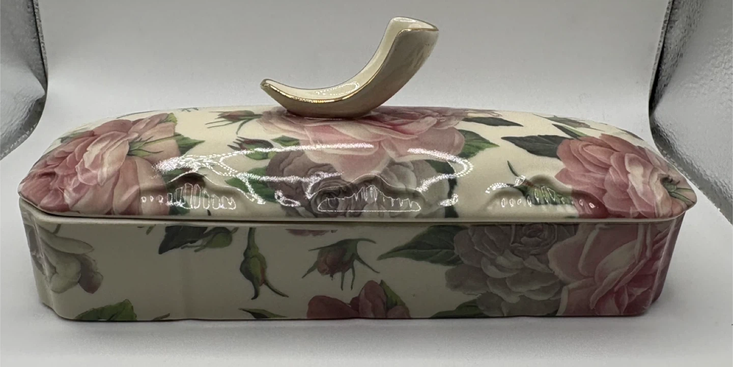 Selling a lovely Vintage Rosalin trinket box with a beautiful floral design! It's perfect for storing jewelry or other small keepsakes. The box is in great condition and would make a wonderful addition to any home