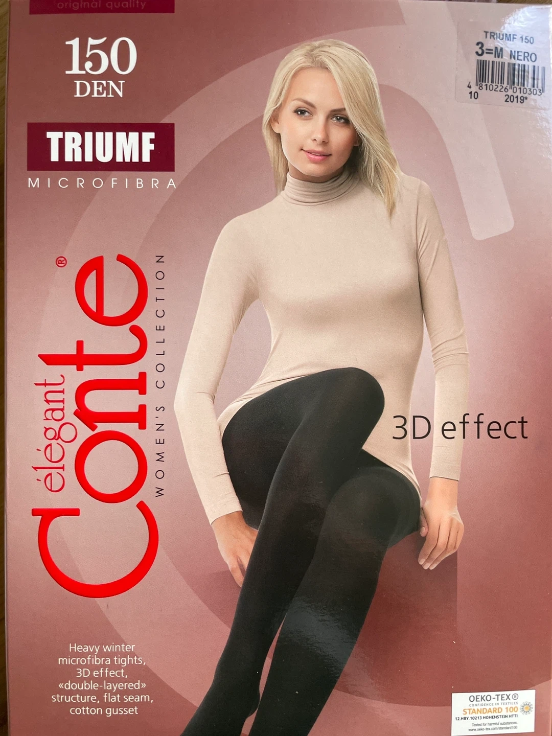Selling a pair of Conte Elegant Triumf 150 DEN tights in black, size M. These tights feature a 3D effect and are made with microfibre for a comfortable fit. They have a double-layered structure, a flat seam, and a cotton gusset. Perfect for the winter season!