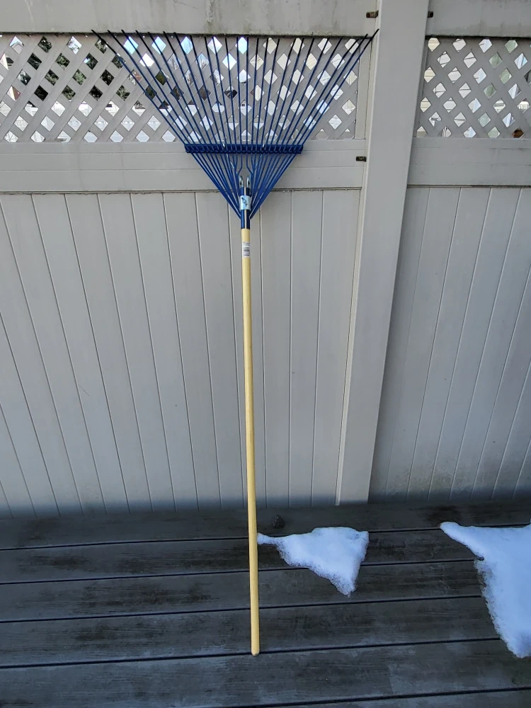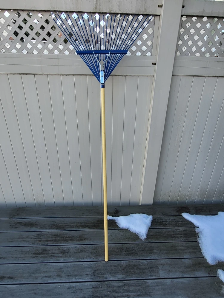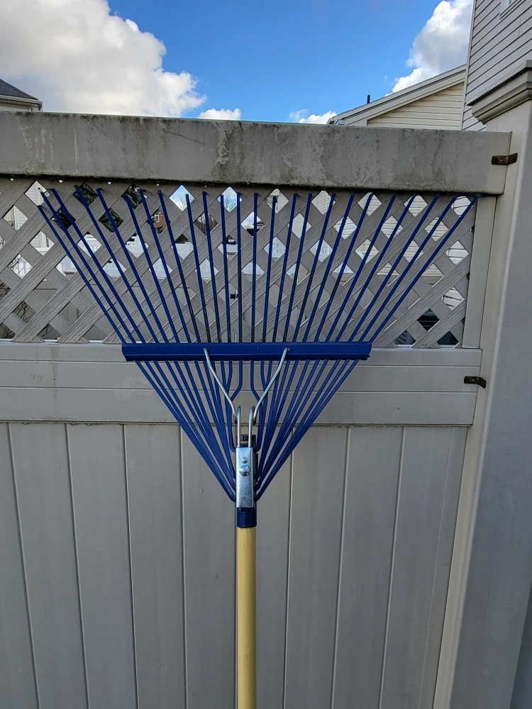 Selling a leaf rake with a blue head and wooden handle. It's in great shape and ready for fall cleanup.