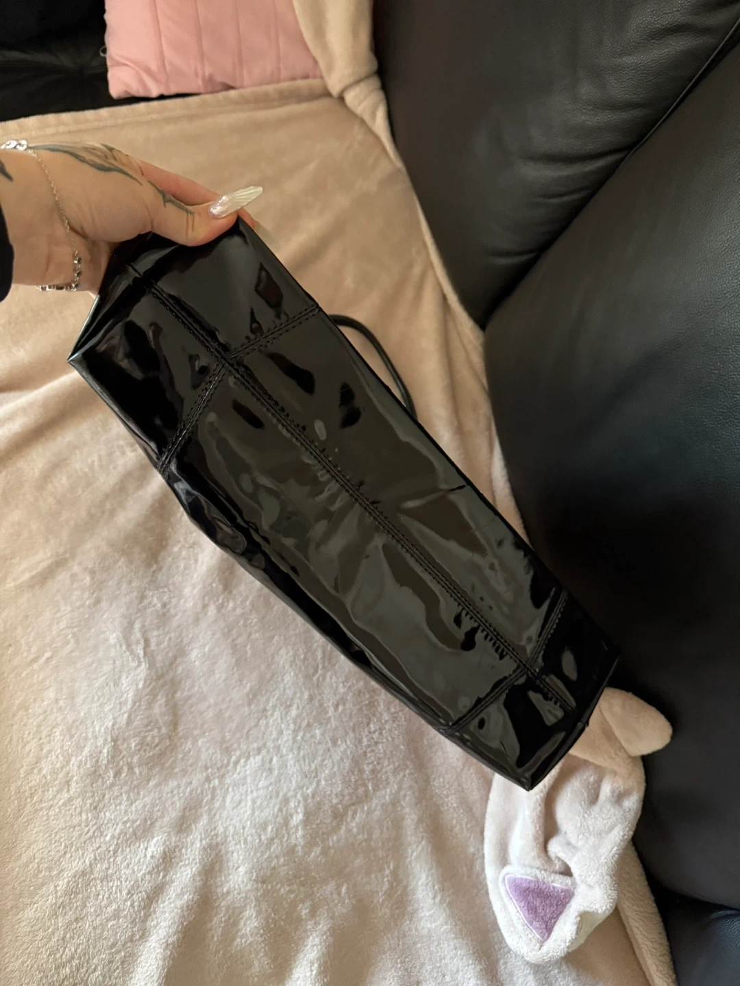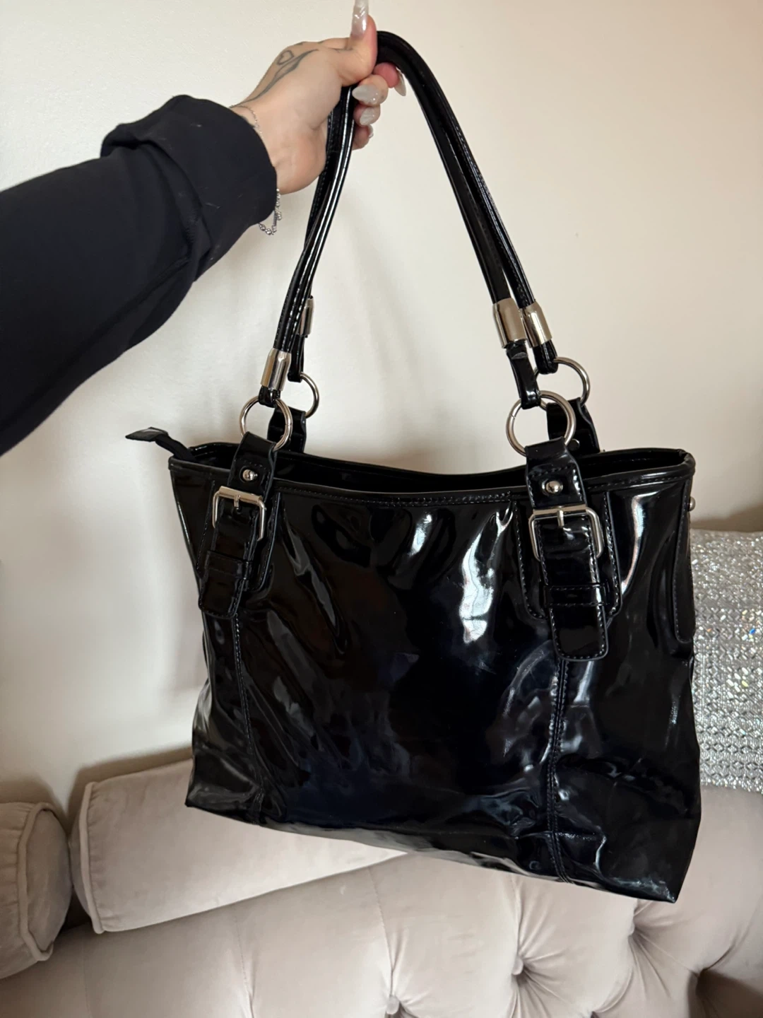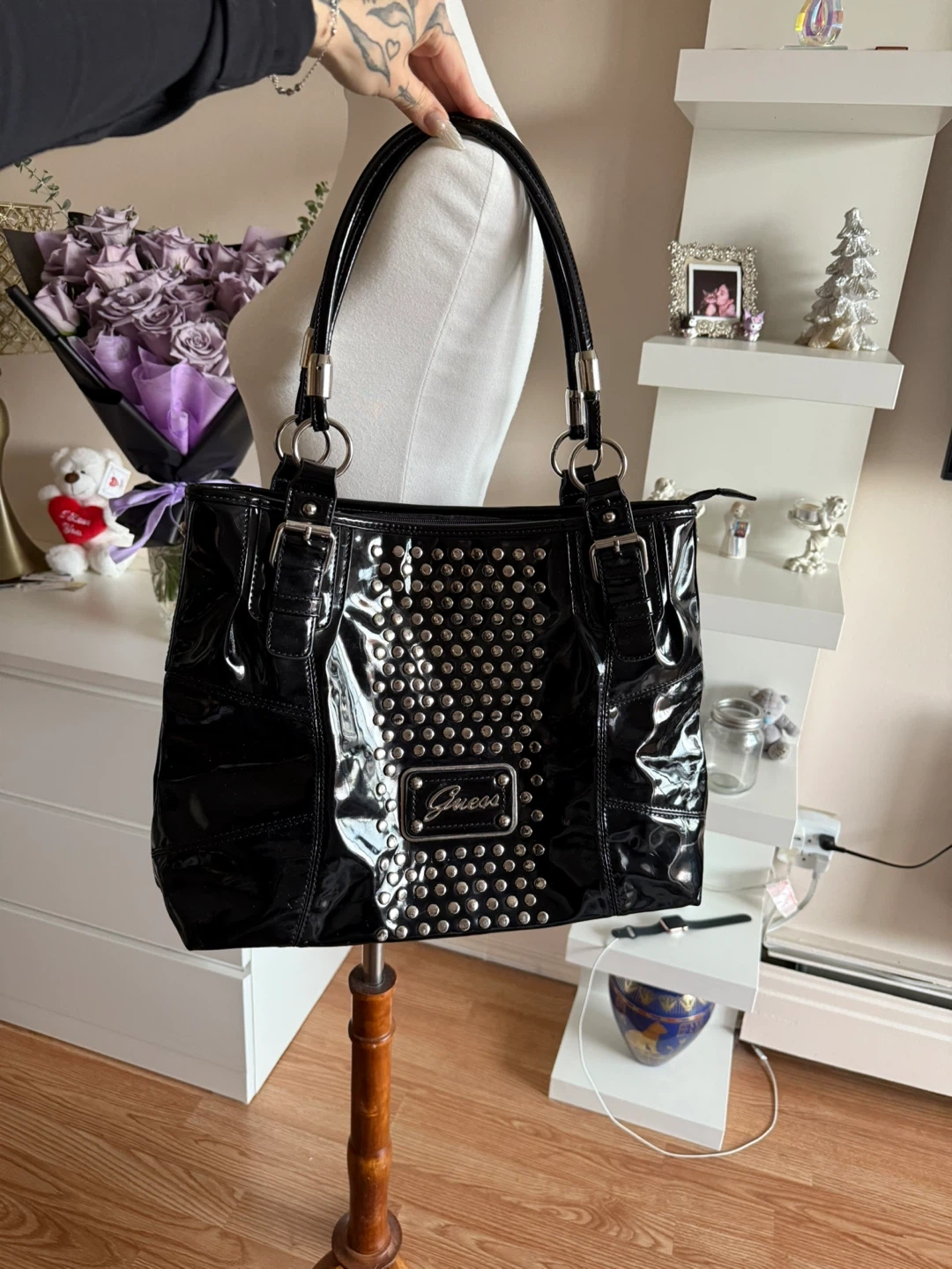 Selling a stylish Guess tote bag in black patent leather! It features a cool studded design and is perfect for everyday use. The bag is in great condition and ready for a new home!