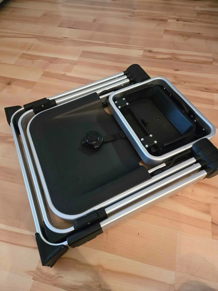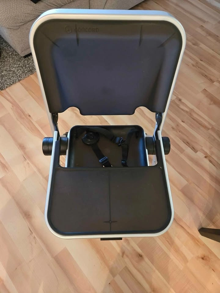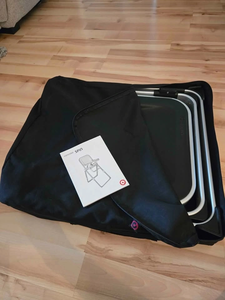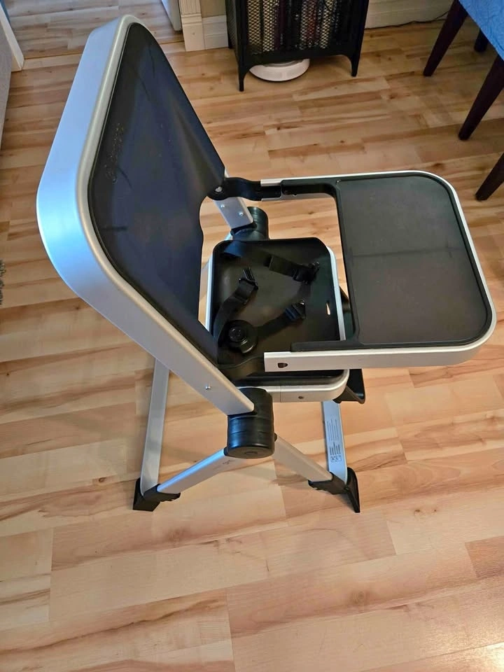 This high-chair is still in excellent shape, and folds up beautifully into the storage bag (pictured). Legs are adjustable-height, so you can use this from a young age right up until your kid ages out of needing a high chair. Weighs around 15 lbs and measures about 18 by 18 inches when it's flat in the case.