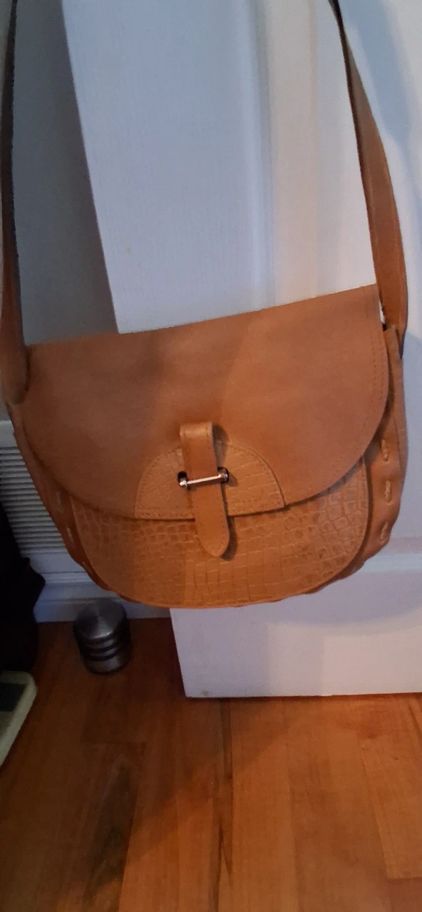 A stylish tan leather saddle bag! It's in great condition and ready for a new home. The bag features a unique crocodile-textured flap and a comfortable shoulder strap. Perfect for everyday use or a night out